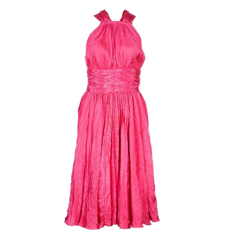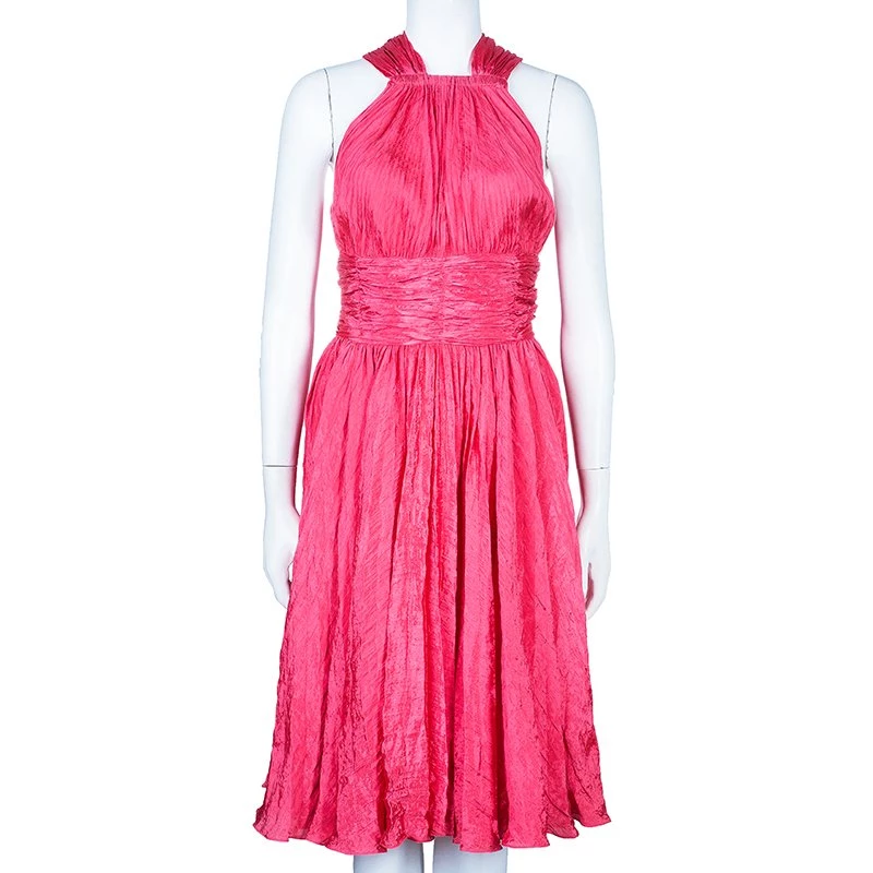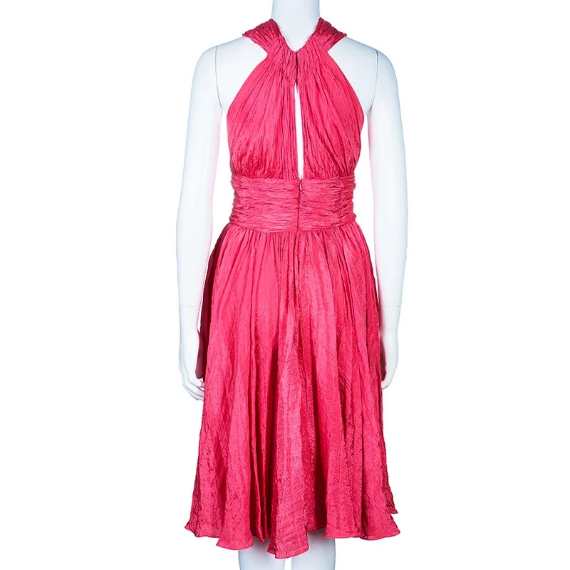 This charming Oscar de la Renta dress is delicate and exquisite in its design. Made from rushed silk and polyester, this sleeveless dress features gathered pattern flowing through the dress. It has a rear zipped closure. Wear these with pumps or wedges for a chic look!