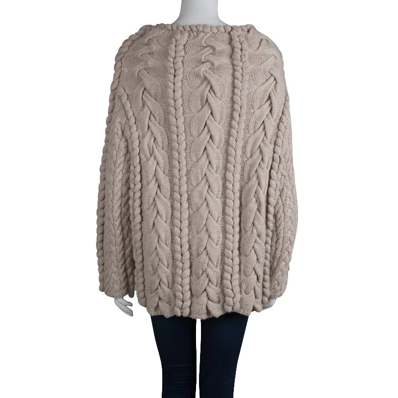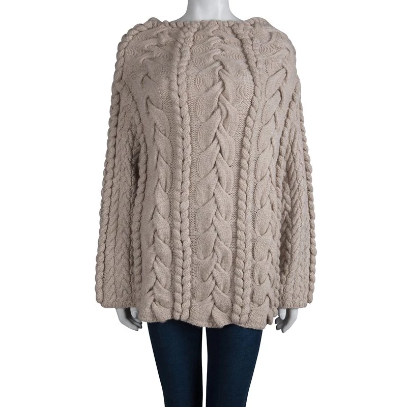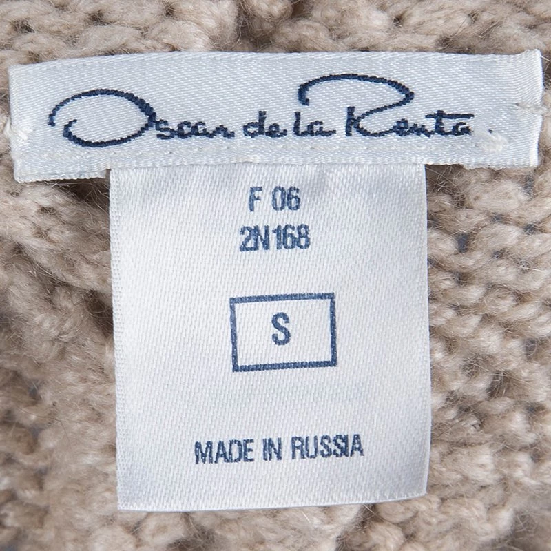 This beige cashmere knitted sweater from the luxurious brand Oscar De La Renta is stunning, with a decorative chunky knit detail throughout the sweater. It has three-quarter sleeves and the centre front has a hook and eye closure. The sweater looks elegant and goes well when teamed up with a pair of jeans or a skirt.