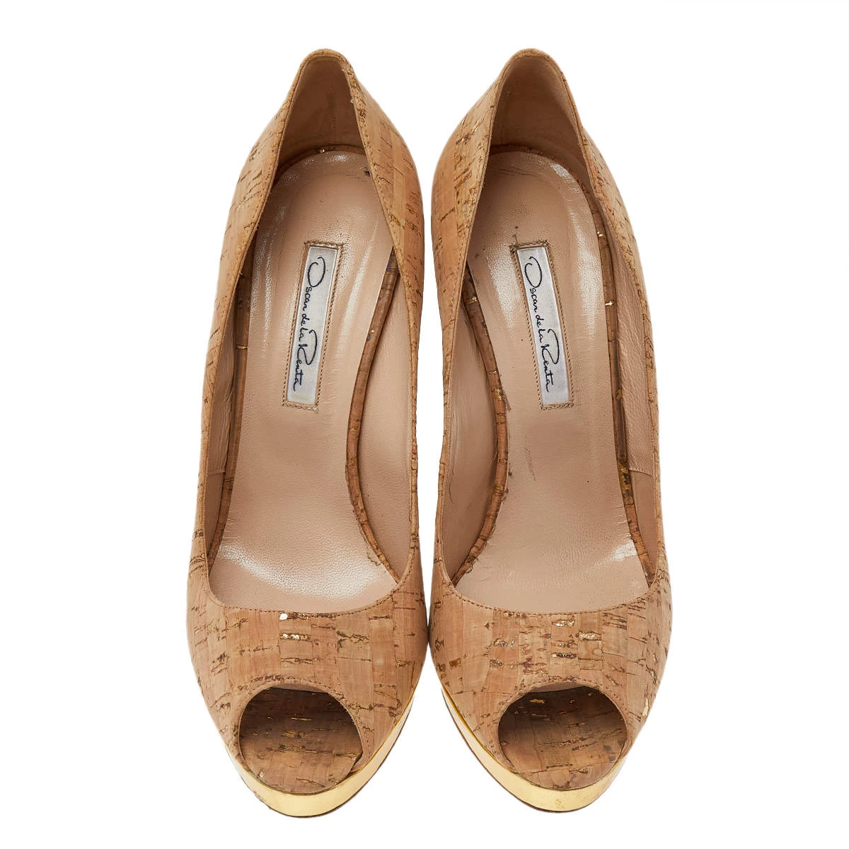 Add a subtle touch of magic to your look by donning these leather pumps. This fabulous pair of Oscar de la Renta pumps are designed with peep toes, high heels, and slender platforms.