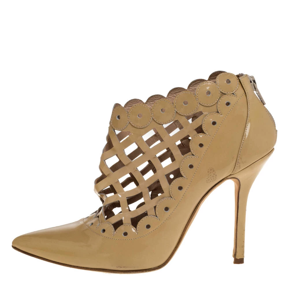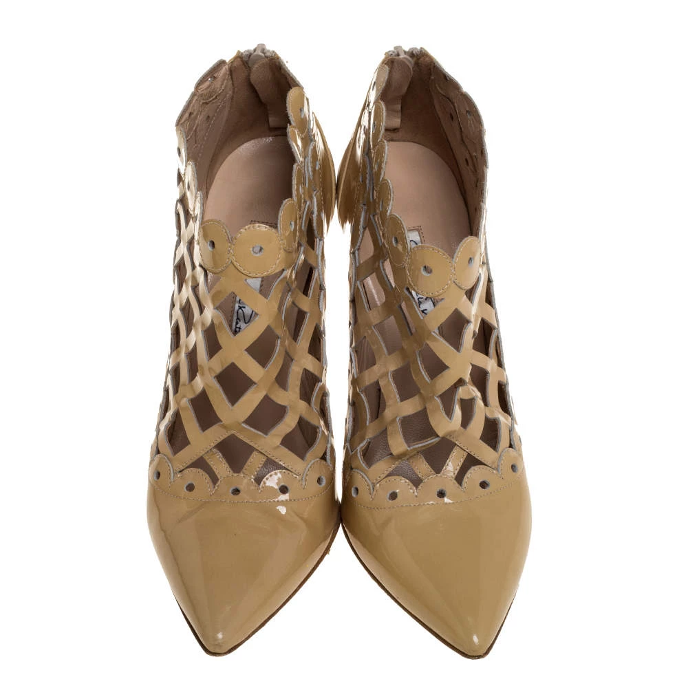 We are loving the luxe feel that these gorgeous Oscar de la Renta ankle booties exude. They are crafted from patent leather and have striking laser-cut details. They have zip closure at the back and are lifted on 10.5 cm heels.