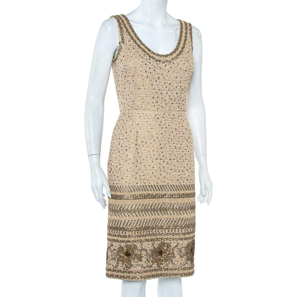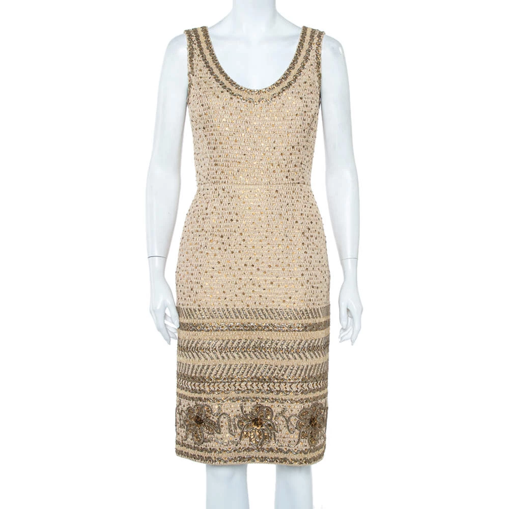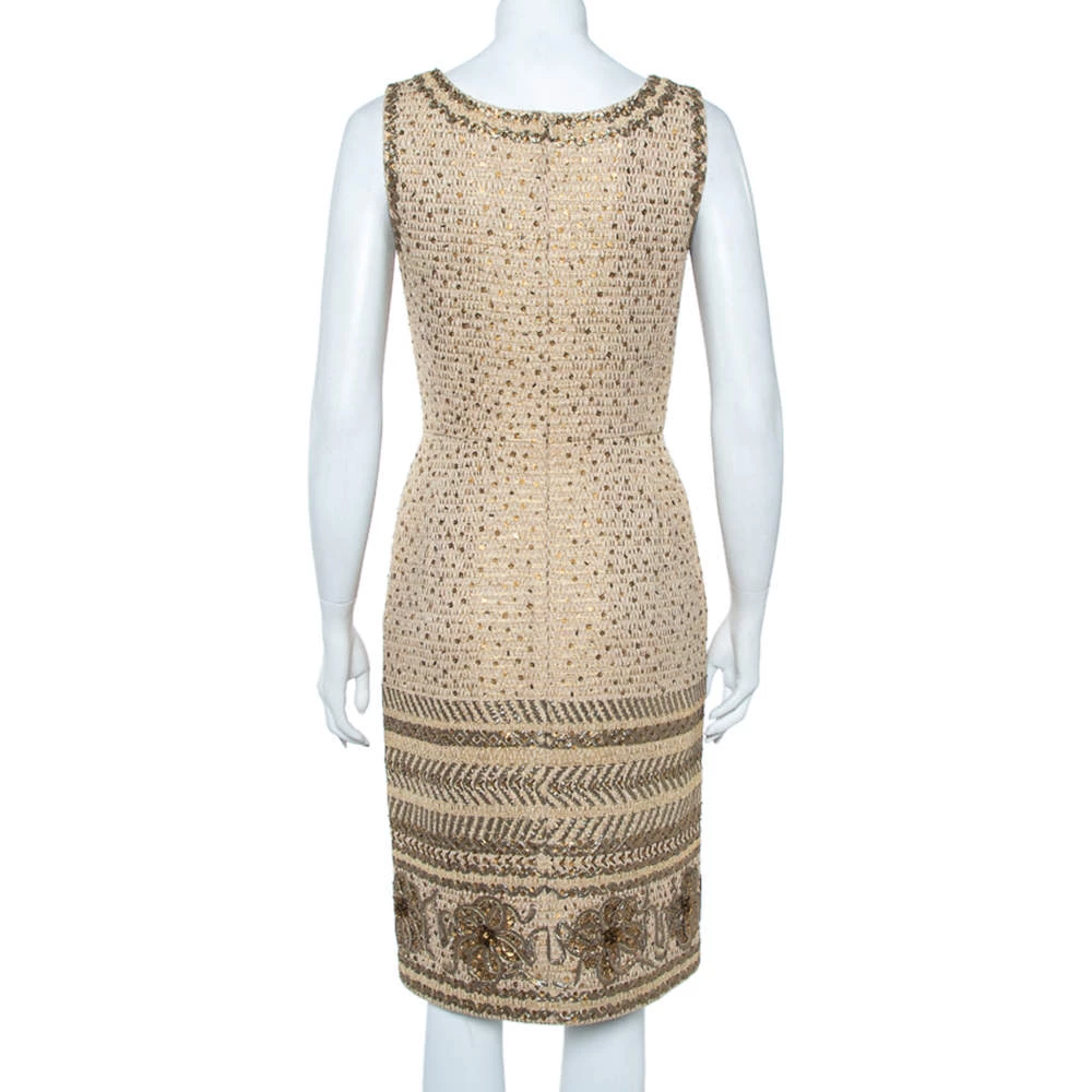 Dress up in this Oscar de la Renta dress and pair it with statement accessories. Choose this beige, sequin-embellished dress when you are out and about in the city. Crafted in tweed, this chic dress is sure to grab everyone’s attention.