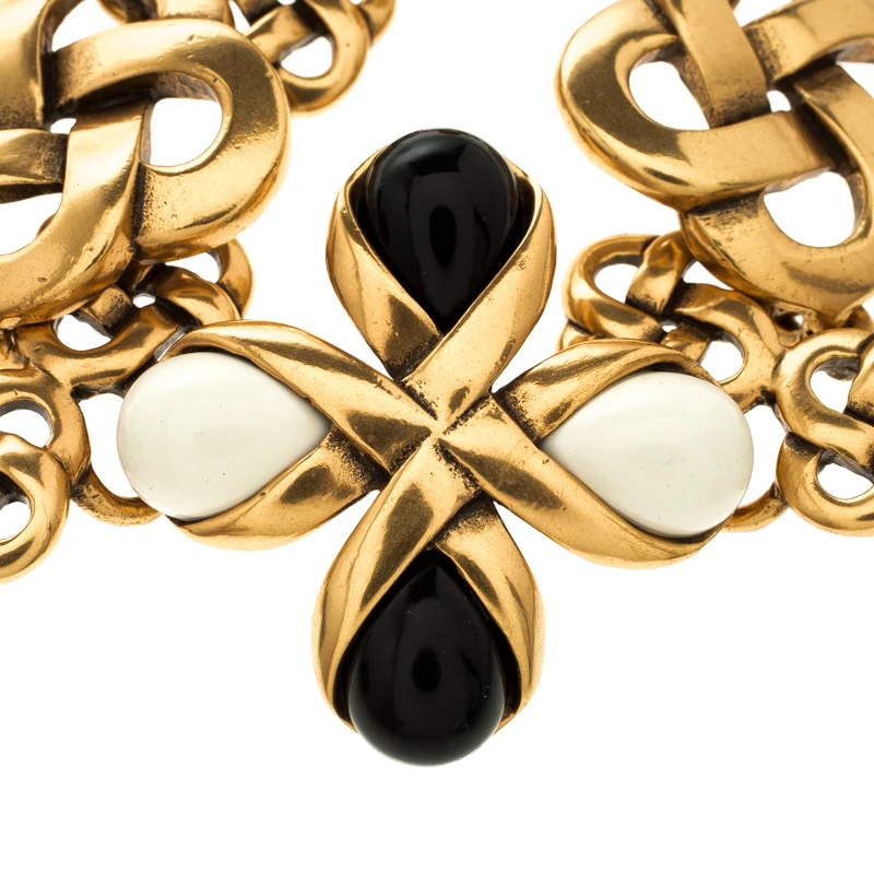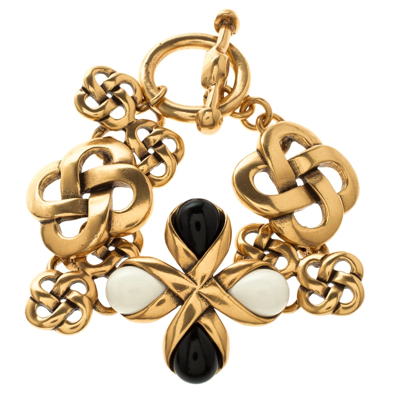 A beautiful piece for those special outfits, this Oscar De La Renta Toggle bracelet will pair with both your day and evening looks with ease. Constructed in gold tone metal, this bracelet features toggle design with chain and black and white resin stones to complete the look.