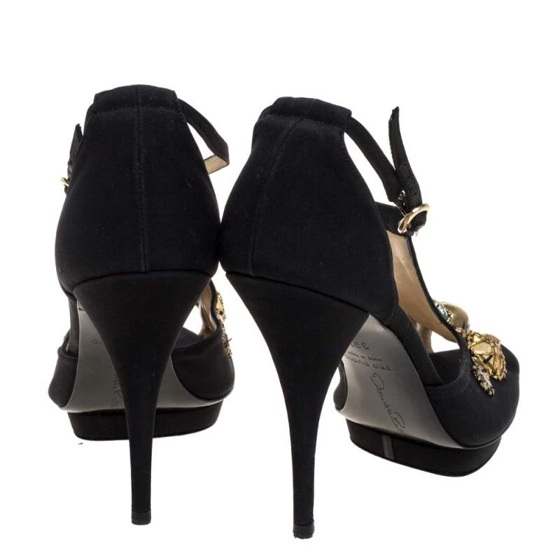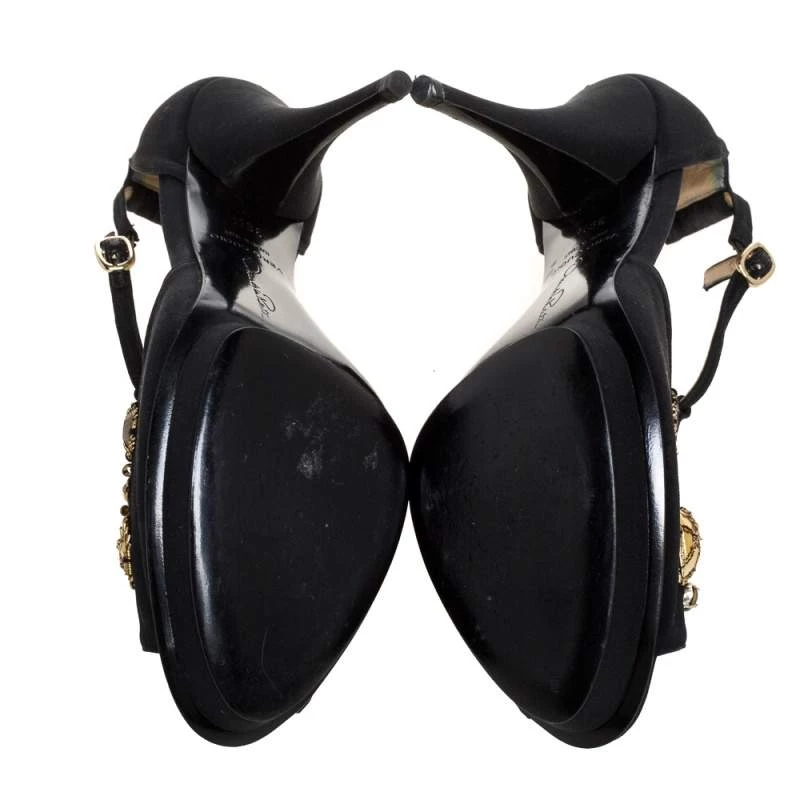 These black fabric sandals will keep your feet feeling fashionable all day. These sandals from the house of Oscar de la Renta are a fine blend of comfort and class. They feature embellished details on the vamps, buckled ankle straps and 11 cm heels.