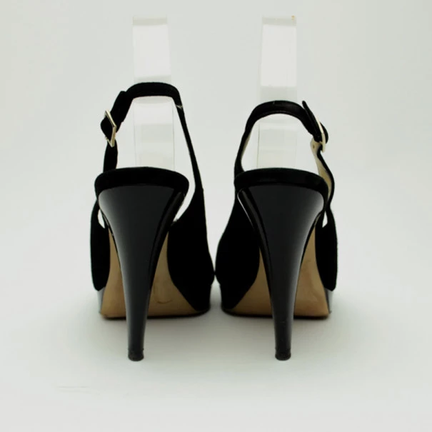 Get a flawless sexy finish with these gorgeous Oscar De La Renta Black Leather & Suede Peep Toe Platform Slingback Sandals. They are made from black leather and come with round peep toes and 12cm heel. These slingback style sandals feature cutout detailing at the toes. The leather lined insoles feature Oscar De La Renta labels.Original Retail Price: US $645