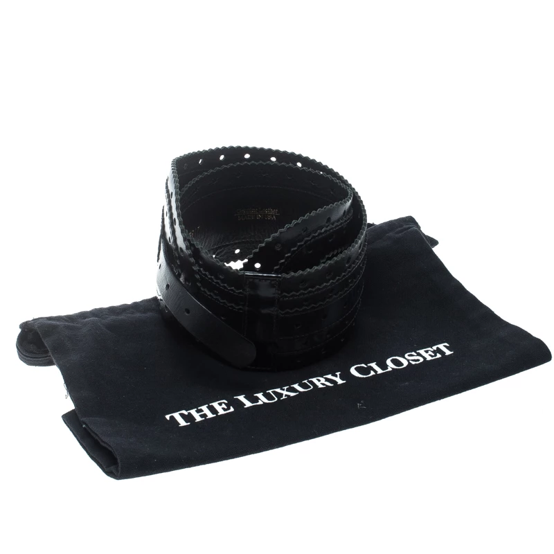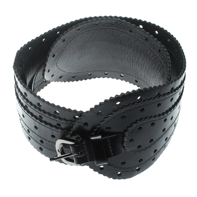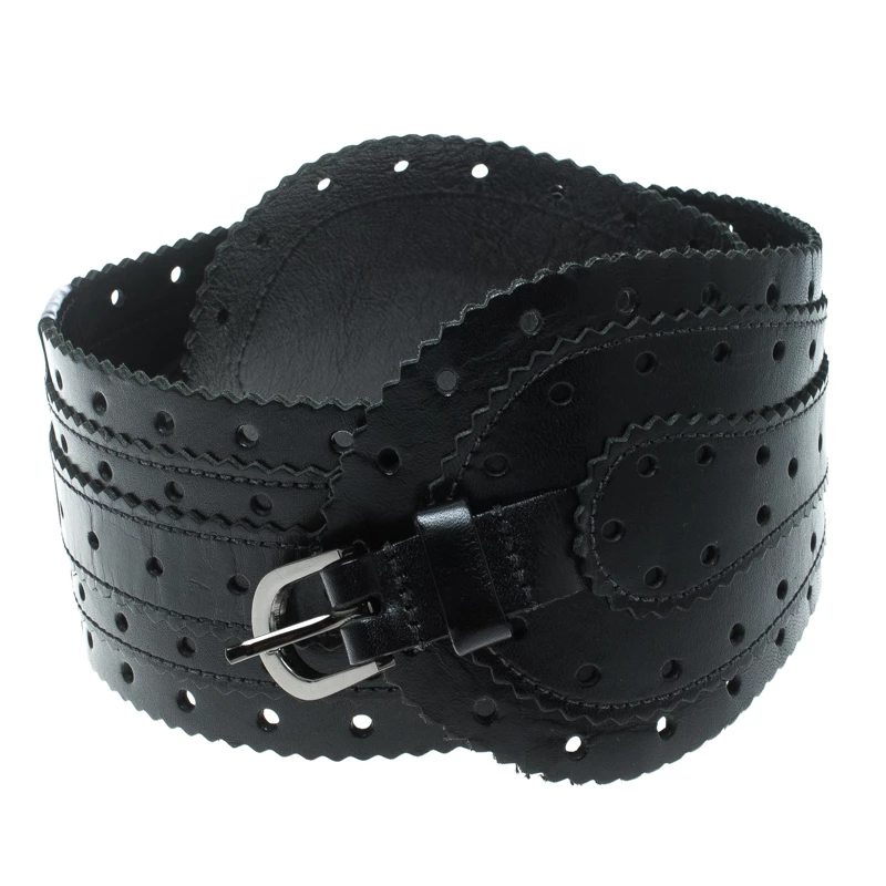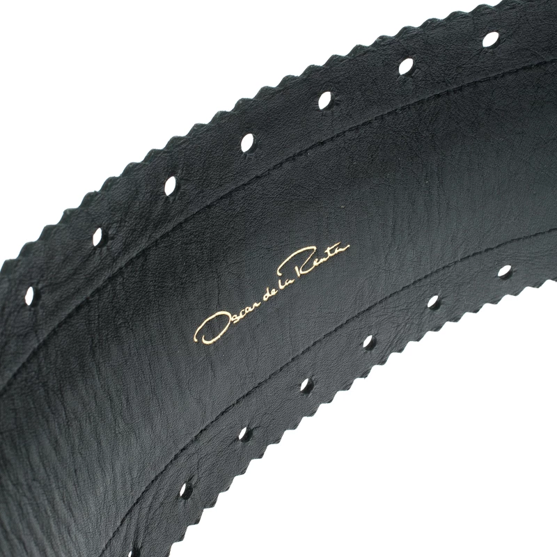 Whether you accessorize it with flattering dresses or with maxi skirts, this fabulous belt from Oscar de la Renta is sure to make you look very stylish. The black belt is crafted from leather and features a layered design with multiple holes detailed all over it. A sleek buckle in the centre joins the two sides and forms an impressive shape. Grab it today for your belt collection needs another interesting piece!