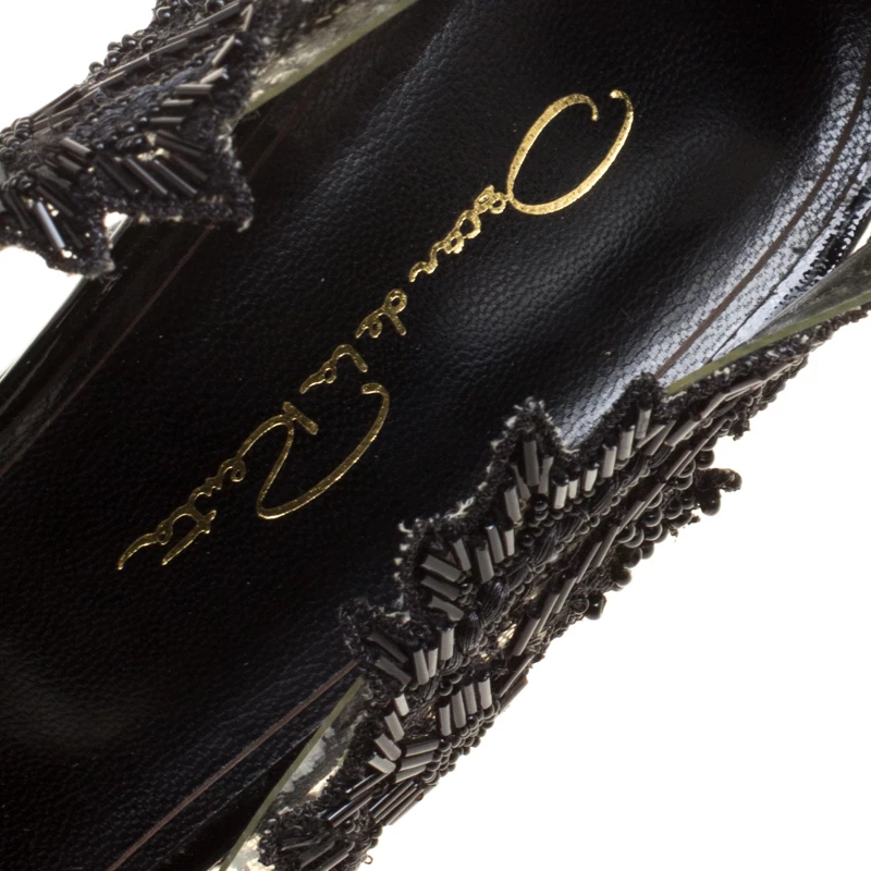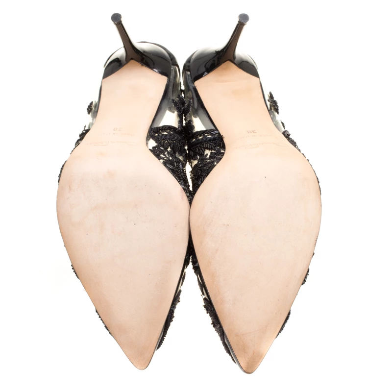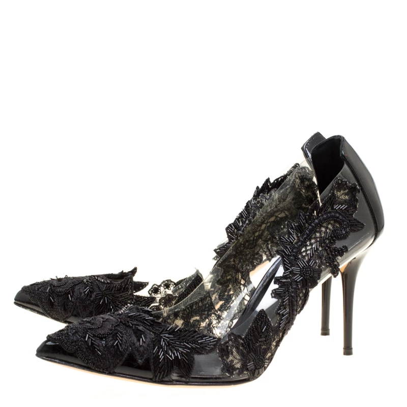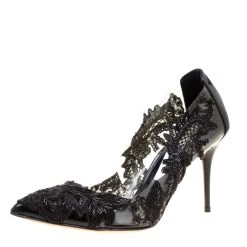 Scintillating, ravishing and regal, these Alyssa pumps from Oscar de la Renta are sure to make you fall in love with them. These black pumps are crafted from patent leather and PVC and feature an elegant silhouette. They flaunt an exquisite embroidery detailing on the pointed toes and along the PVC panels that looks absolutely breathtaking! Comfortable leather lined insoles and 9 cm stiletto heels complete this ethereal pair.