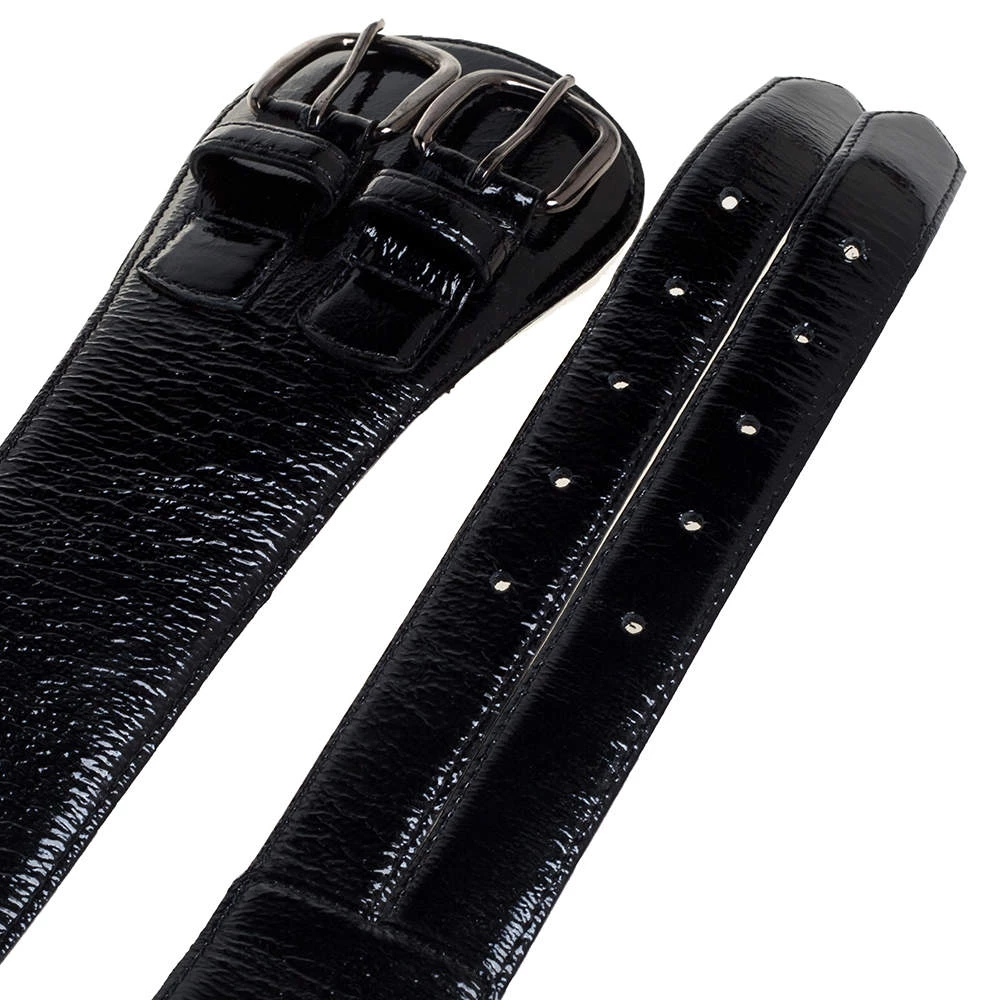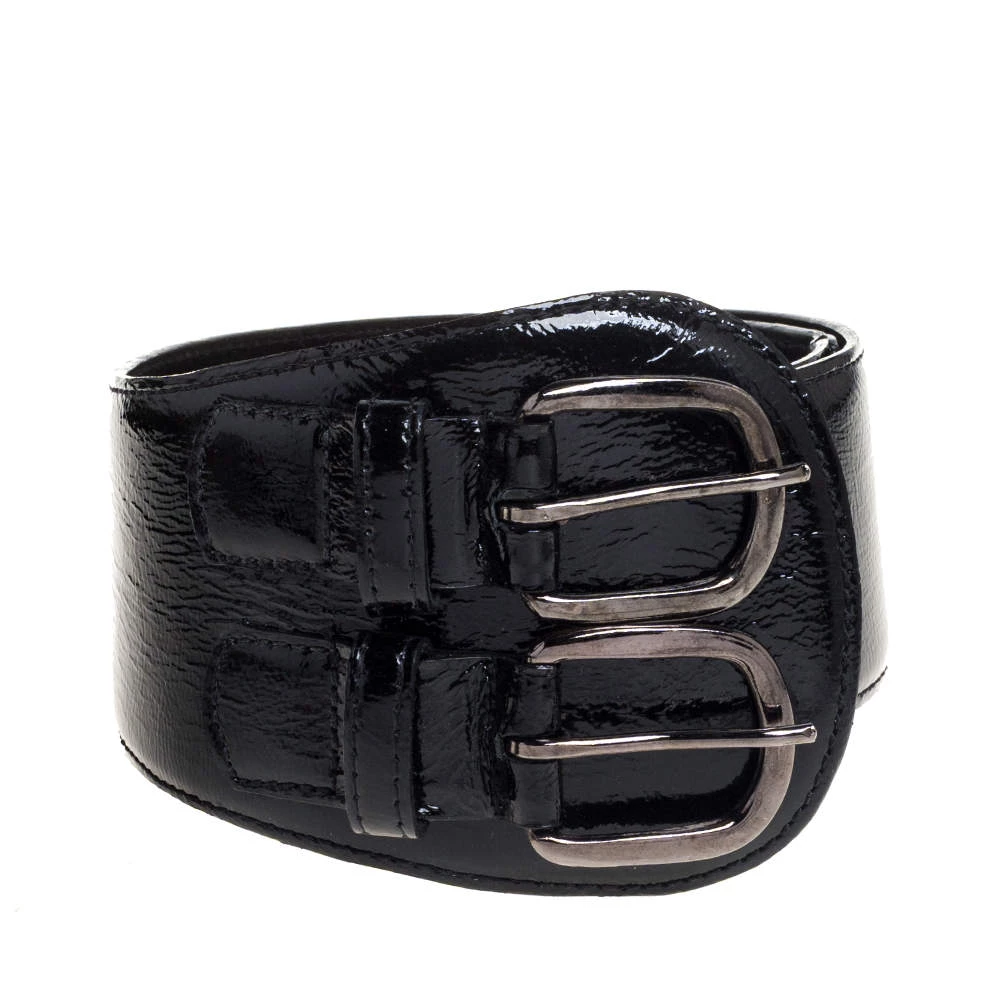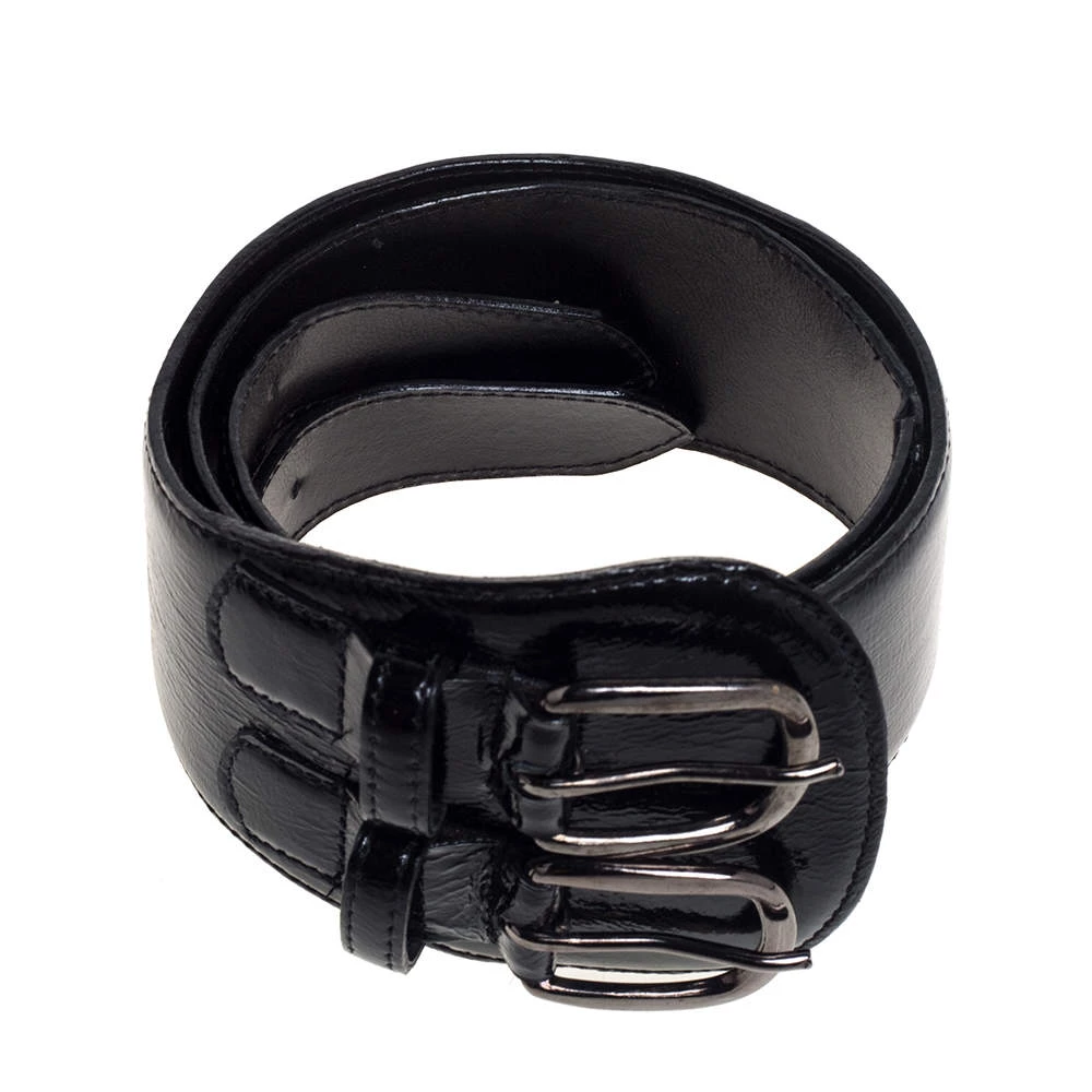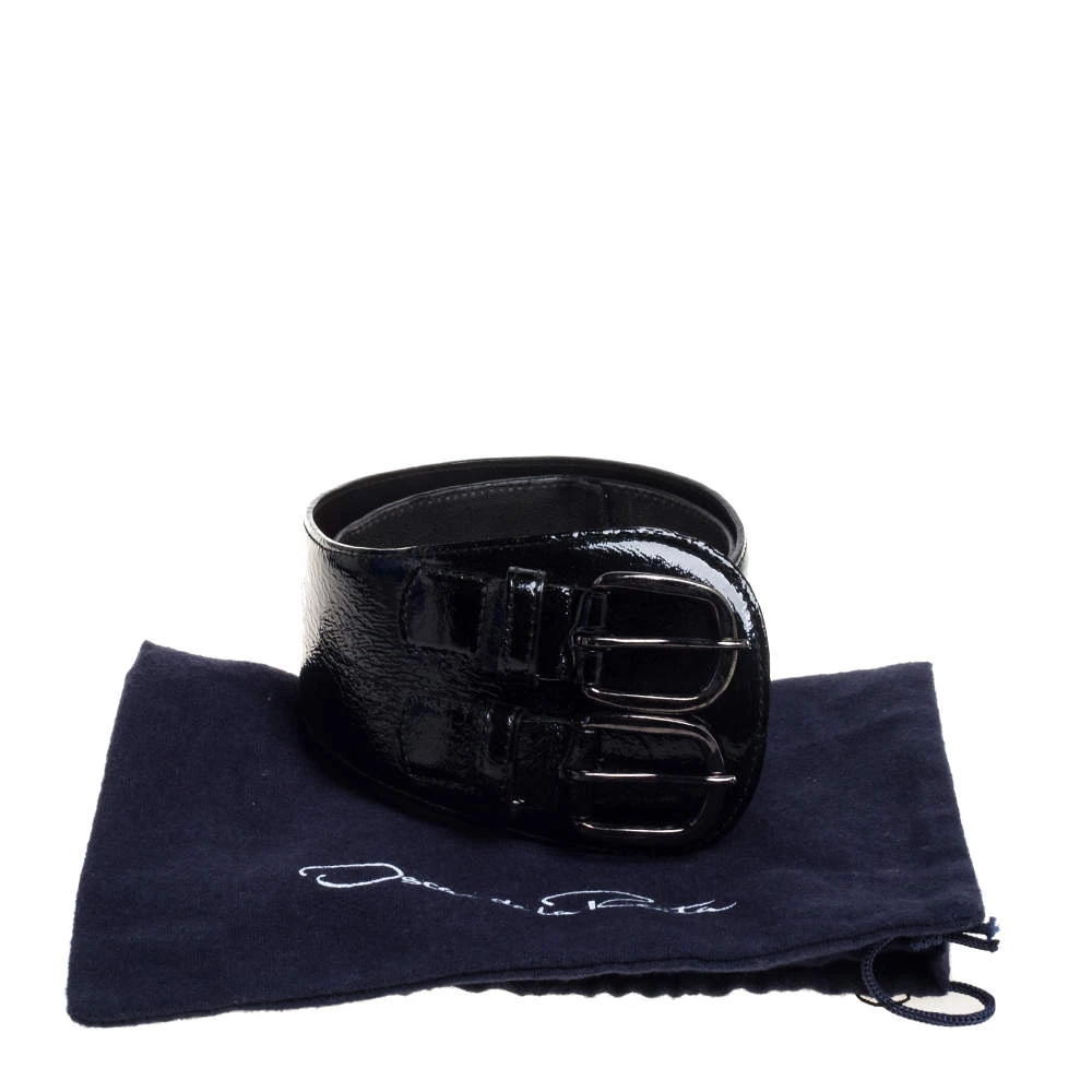 This Oscar de la Renta black patent leather belt for women is designed to be a handy accessory. The belt is adorned with two buckles and two leather loops. Style this belt over your dresses, blazers, and skirts for a stylish revamp.