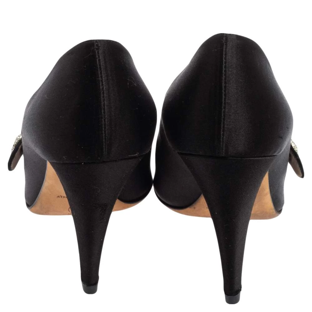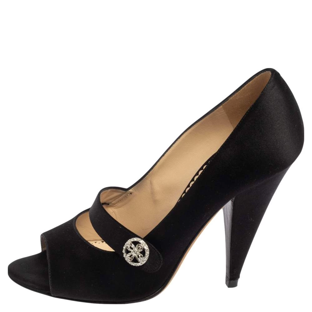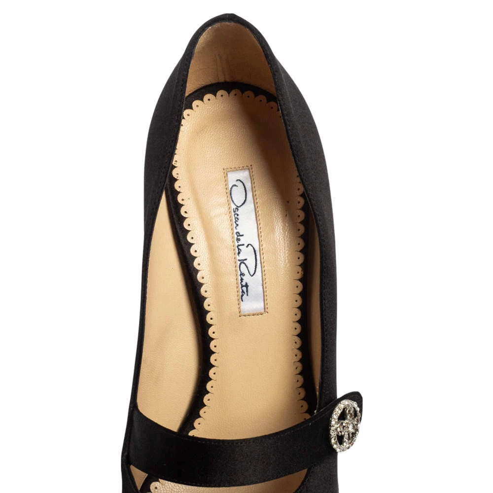 The charm and glamour of these Oscar de la Renta pumps will certainly make your heart flutter. They are crafted with black satin in an open-toe silhouette. This stylish pair comes with a strap on the vamps secured by an embellished buckle, leather-lined insoles, and 12 cm heels.