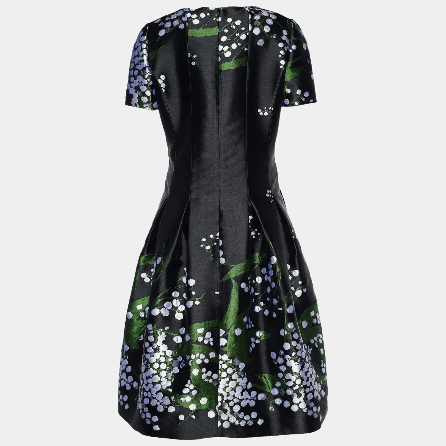 How wonderful and elegant is this Oscar de la Renta dress! Made from silk, this flared dress flaunts a pretty floral print and is black in color. The pleated design and short sleeves add to its chic appeal.