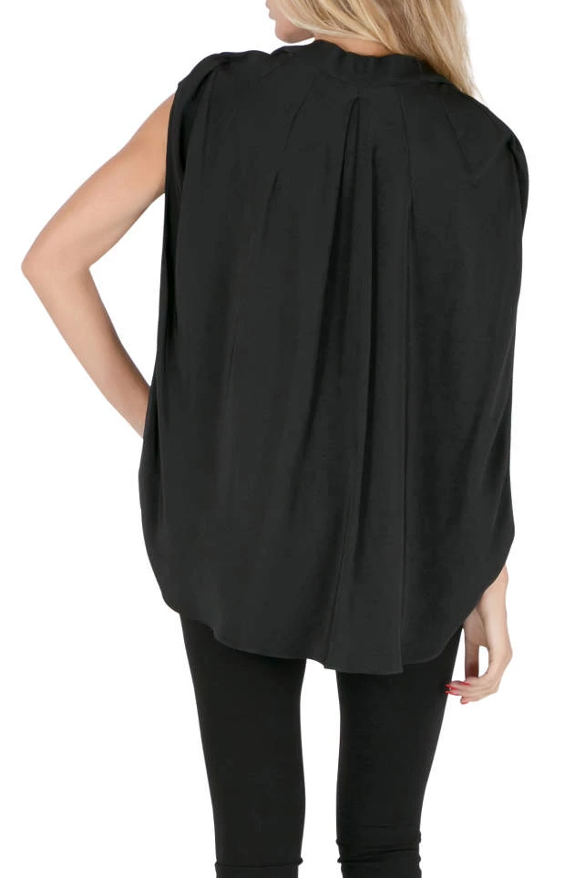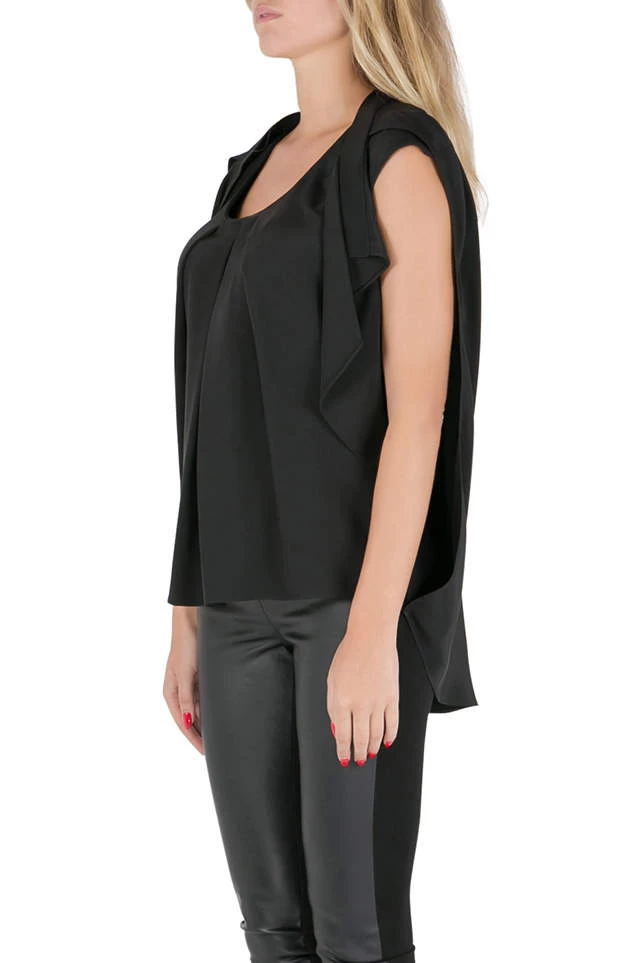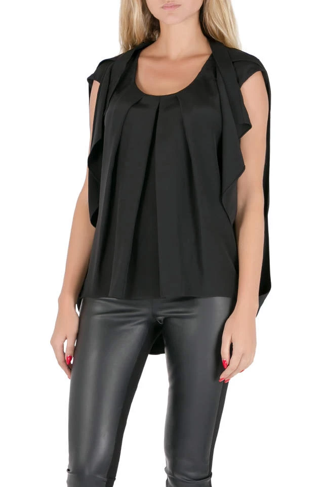 Break the monotonous everyday look with this unique draped front top. The creation of Oscar De La Renta is tailored from smooth silk and comes in black color that will complement any bottoms you team with it. The sleeveless top has a pleated detail and features a zip closure.