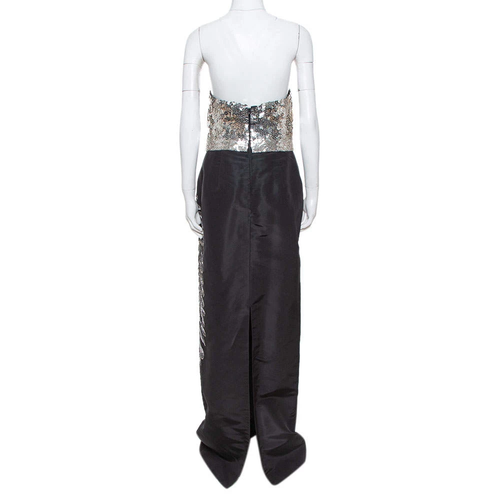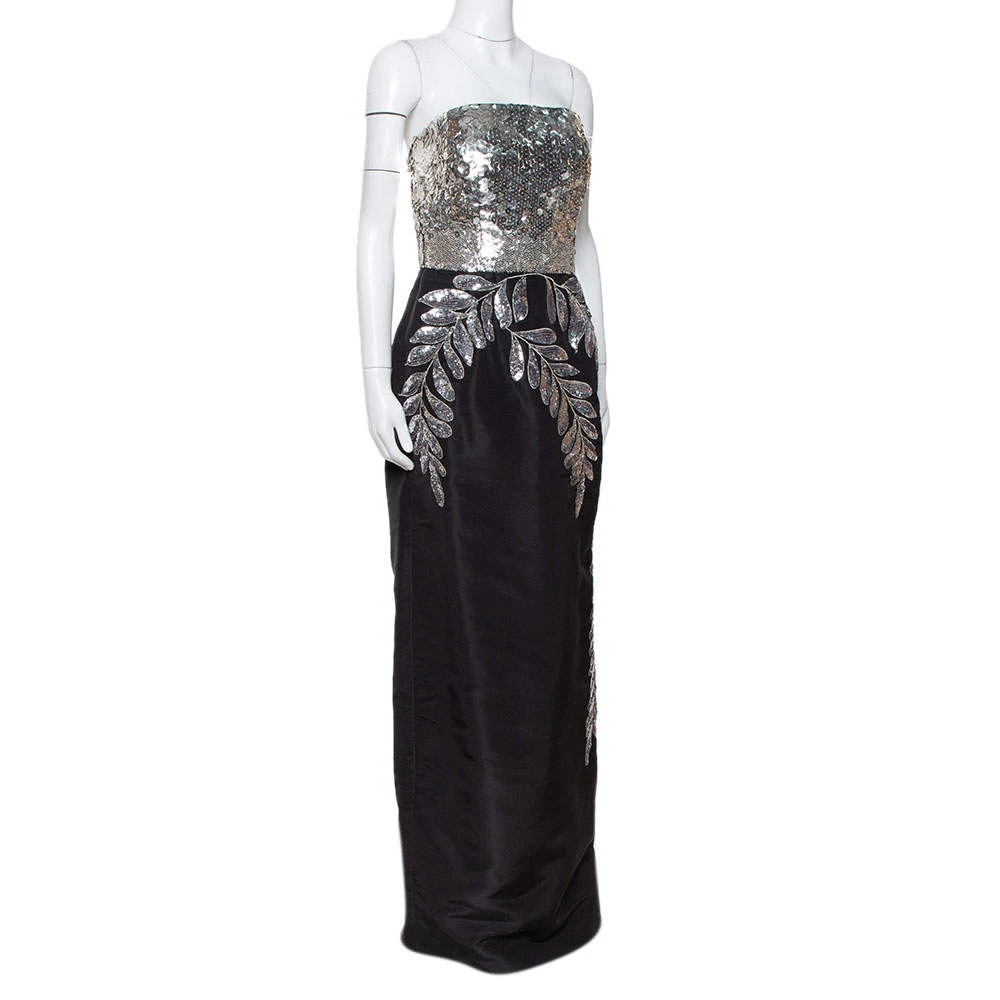 A special evening demands stunning ensembles and this Oscar de la Renta creation is nothing short of legendary. Hailing from the iconic brand’s Resort 18 collection, this gown is all things fabulous. Crafted from pure silk, this black-hued ensemble has a classic strapless silhouette. The bodice has been embellished with glittering sequins while the skirt has been detailed with a leaf-like pattern that is highlighted with sequins as well. The gown is secured with a back-zip closure and is finished with a short train.