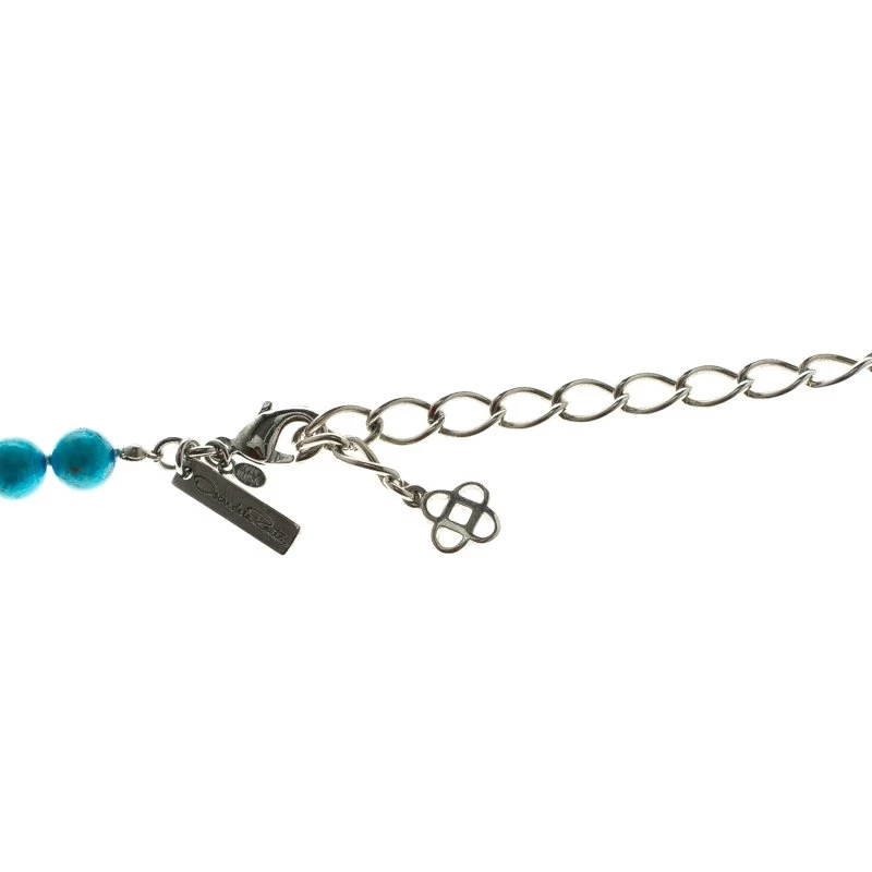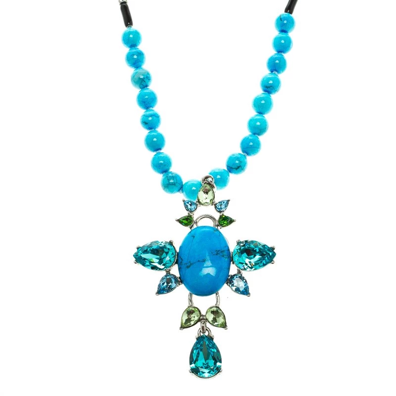 This vibrant necklace is by Oscar De La Renta. It has been designed in a strand of stunning blue beads and accented with an oval bead pendant that is beautifully lined with pear shaped crystals. The piece is complete with the brand’s nameplate and a lobster clasp closure.