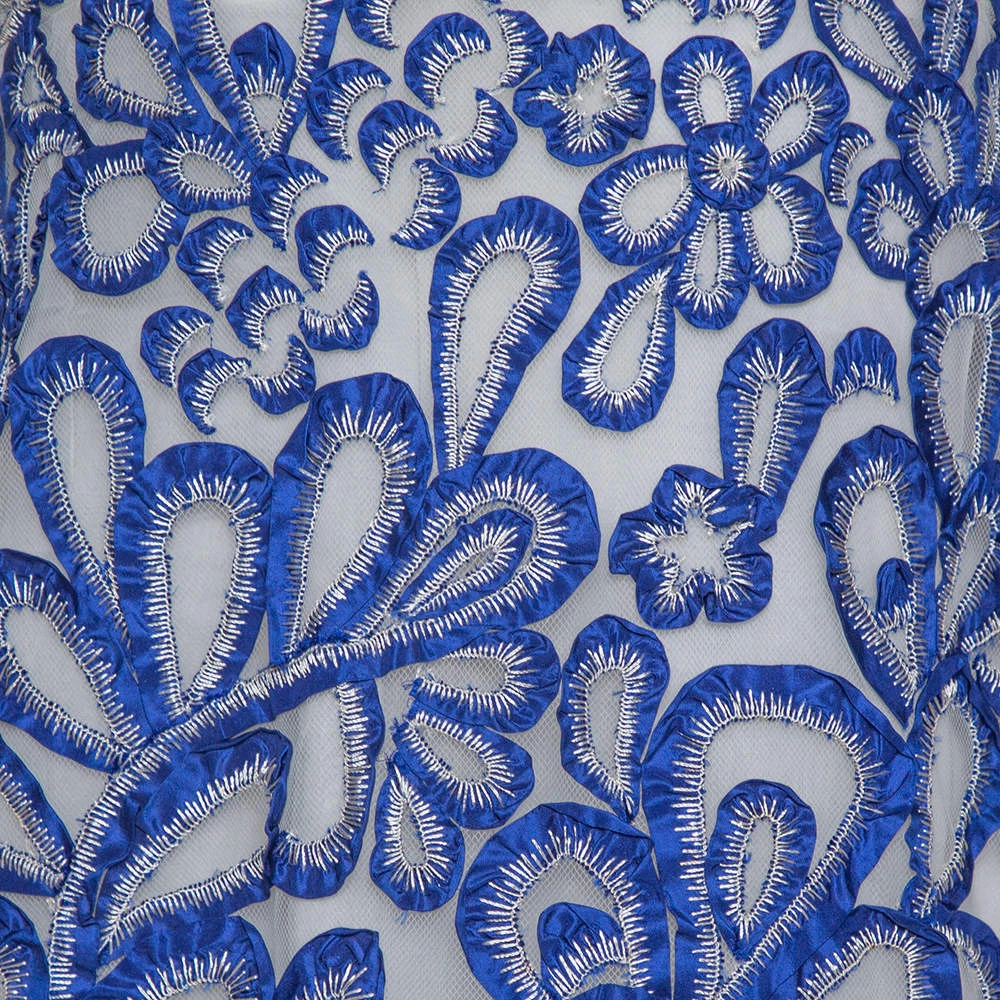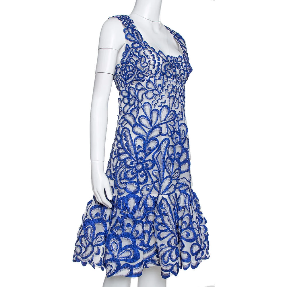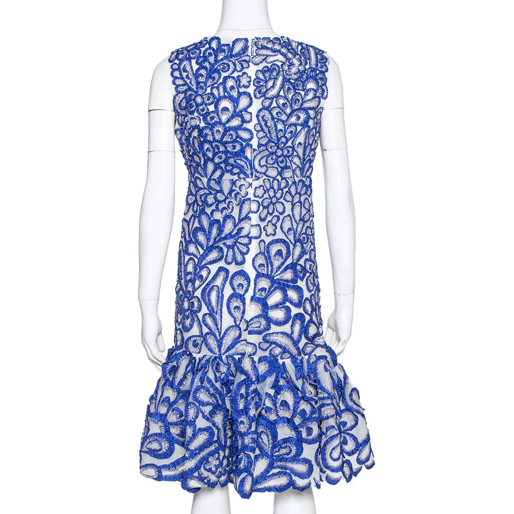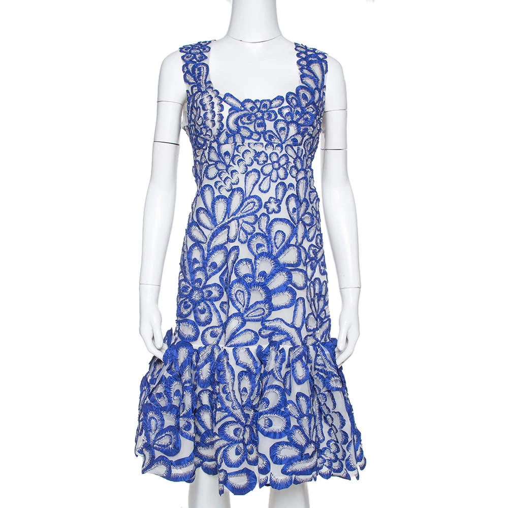 Consider teaming this Oscar De La Renta’s dress with statement accessories for a stylish yet elegant look. It’s tailored from quality nylon flaunting a beautiful blue hue and a wonderful silhouette featuring a flared hem. It is styled with floral embroidery all over and a short length. Designed in a sleeveless style, complete your look by wearing it with high-heeled sandals.