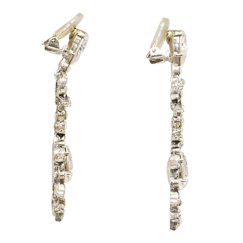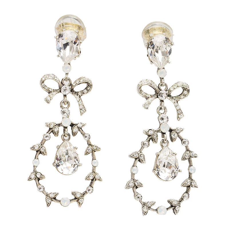 Delicately designed, these clip-on earrings from Oscar de la Renta feature crystals on a silver-tone setting. Feminine and charming, they have petite bows placed above a wreath of leaves. Large crystals are placed in the centre of the wreaths. This gracefully designed pair of drop earrings go very well with an evening dress.