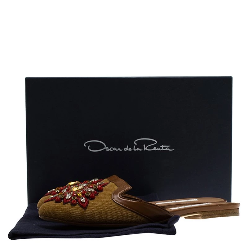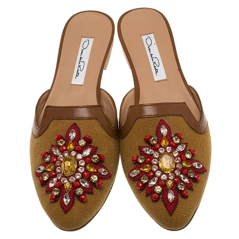 Mules are the much loved summer trend. This pair of Spanish mules is a casual alternative to slides.The vamp in brown color canvas is lined with leather. The almond toe style comes with an embellished notched vamp and padded leather insole. Jazz up your outfit with this pair from Oscar De La Renta.