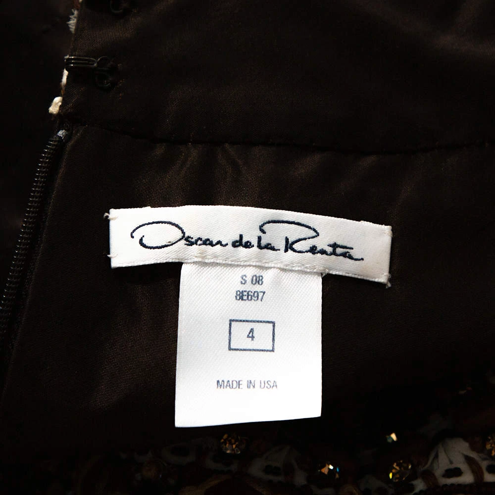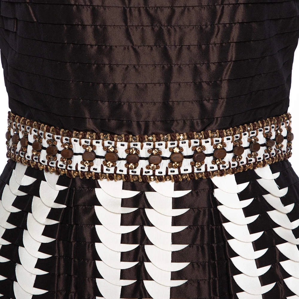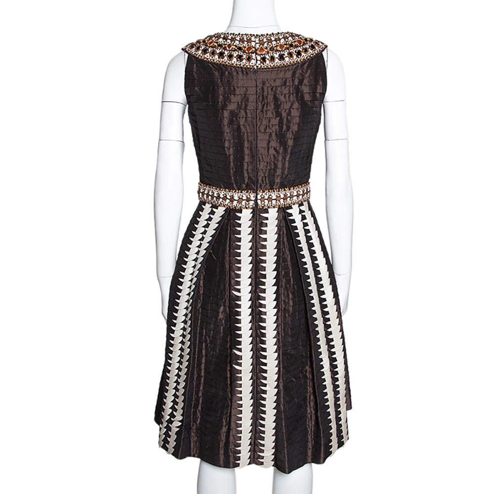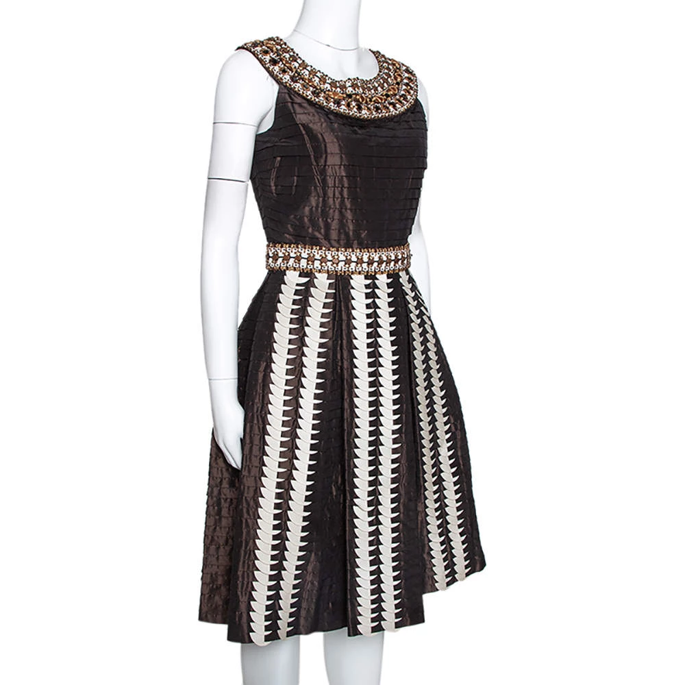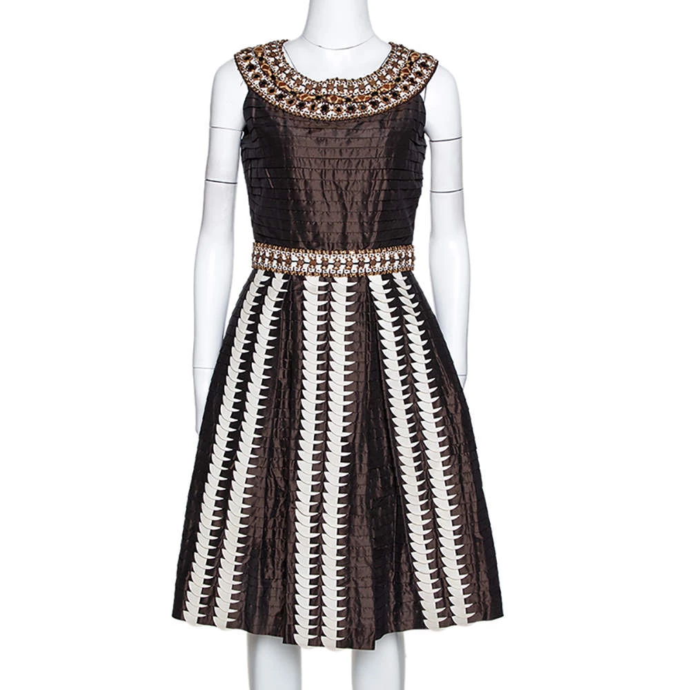 Bring retro back to your collection by accessorizing this Oscar de la Renta dress with oversized sunglasses and wedge heels. For a standout look this season, flaunt this brown dress cut from pure silk. This sleeveless dress is embellished with crystals and beads that add a hint of glamour. It has a full skirt with pleat detailing, zip closure, two pockets and a tailored fit.