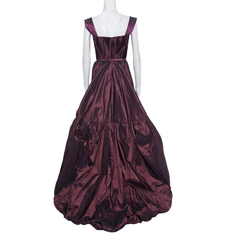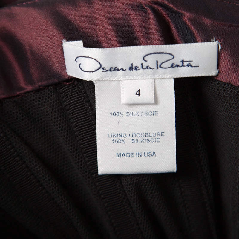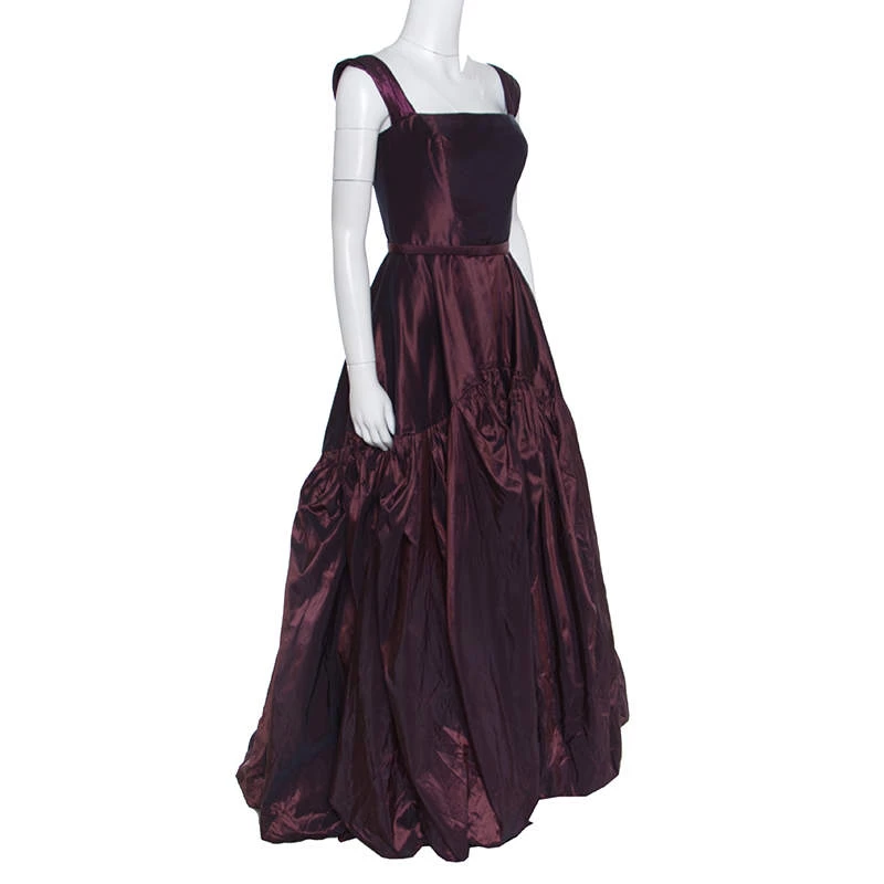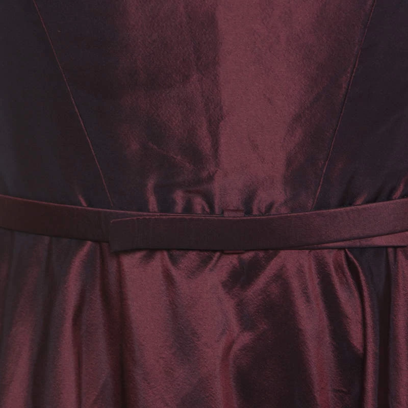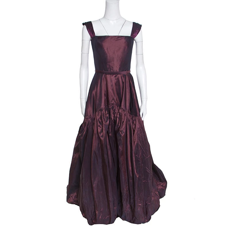 We’ve fallen in love and so will you with this magnificent gown from Oscar de la Renta! This burgundy sleeveless gown is made of 100% silk and features a tiered silhouette. It flaunts a rectangular neckline, a belt detailing on the waist and a concealed zip closure at the back. Pair it with an embellished clutch and platform sandals for a fashionable evening.