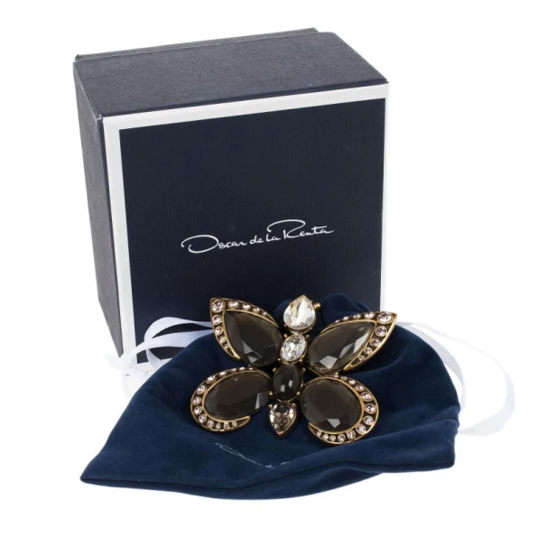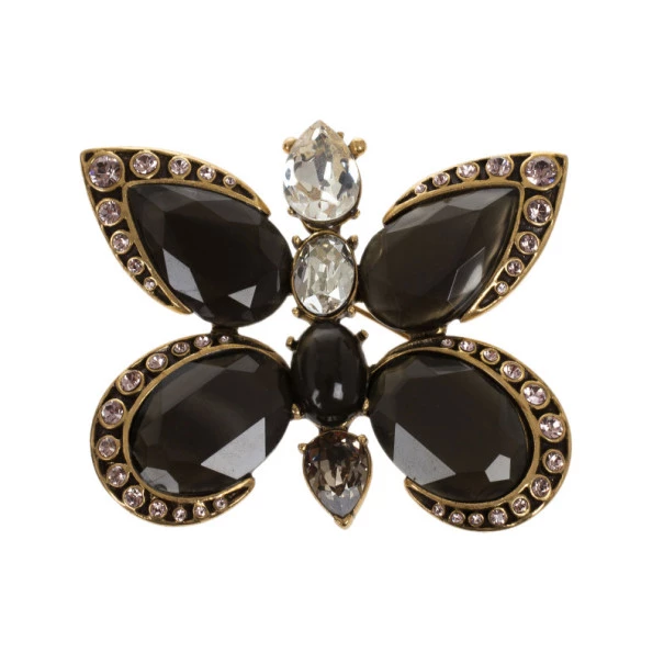 Released as a part of the 2013 collection, this Oscar de la Renta brooch is opulent, fabulous, and mesmerizing. Its butterfly design will set you free for a look filled with class and elegance. Inspired by Oscar’s love for nature, this brooch is designed with hand-poured resin covered with a golden antique finish and a back pin closure. The hand-set Swarovski crystals are matched with faceted stones and a black cabochon at the center.Original Retail Price: US $285
