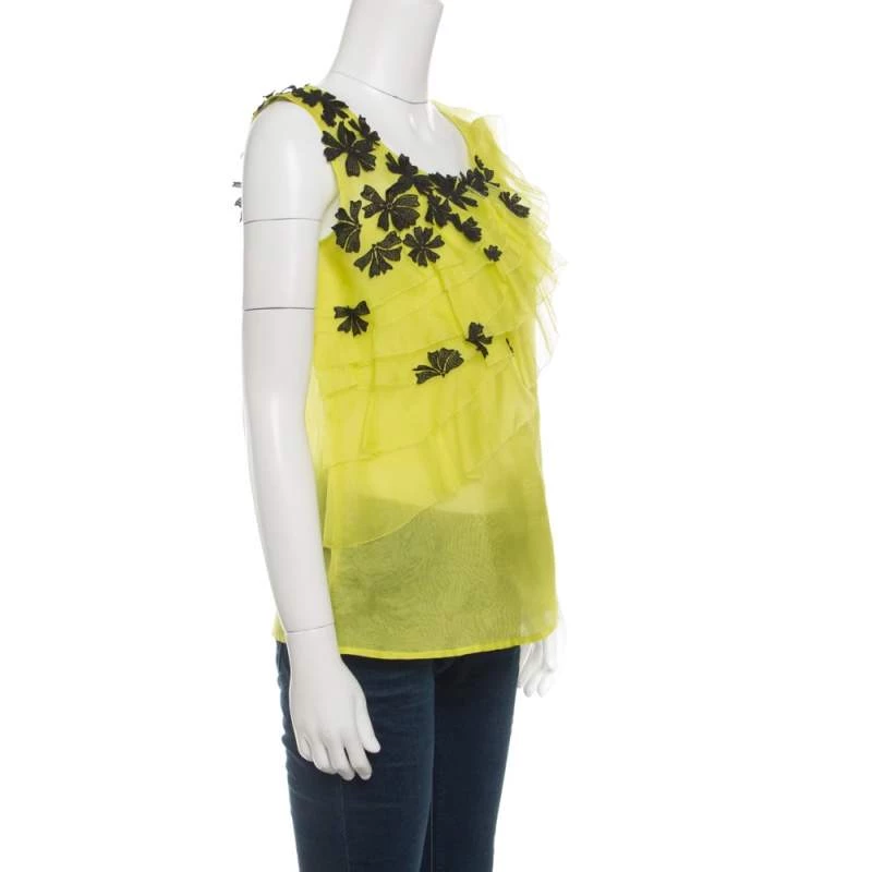 Oscar de la Renta’s top is a great casual piece that can be paired with anything, from shorts and skirts to jeans. It features a chartreuse green hue and ruffles design which is accented with contrasting floral appliques lending a pretty, feminine charm to the top. This sleeveless piece is crafted in silk organza and is certainly a wardrobe staple.