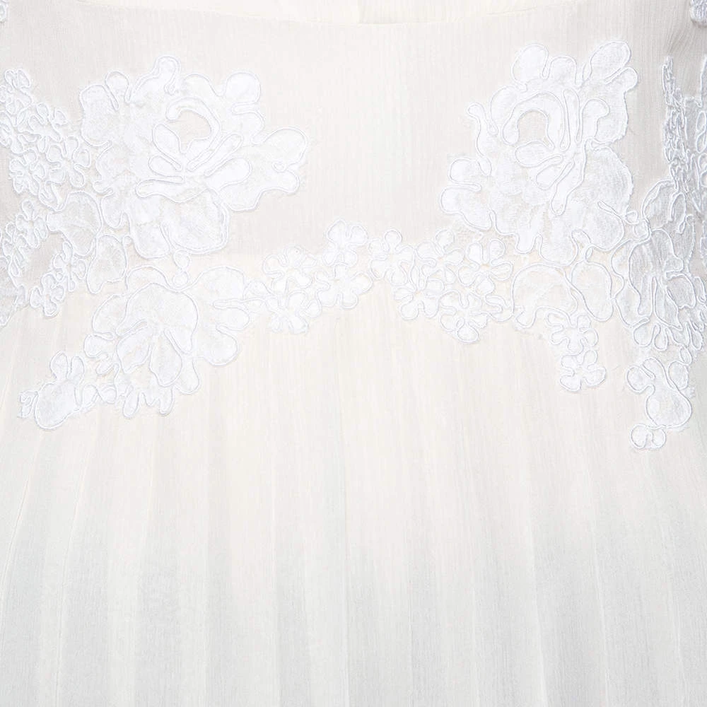 Elevate your wardrobe with this lovely blouse from Oscar de la Renta. Tailored with utmost intricacy, this long-sleeved blouse is made with cream silk that shows lace detailing on top and a plissé panel forming the bottom. A hook-type closure is provided at the back. This blouse can be best paired with black trousers and pumps to achieve a polished look.