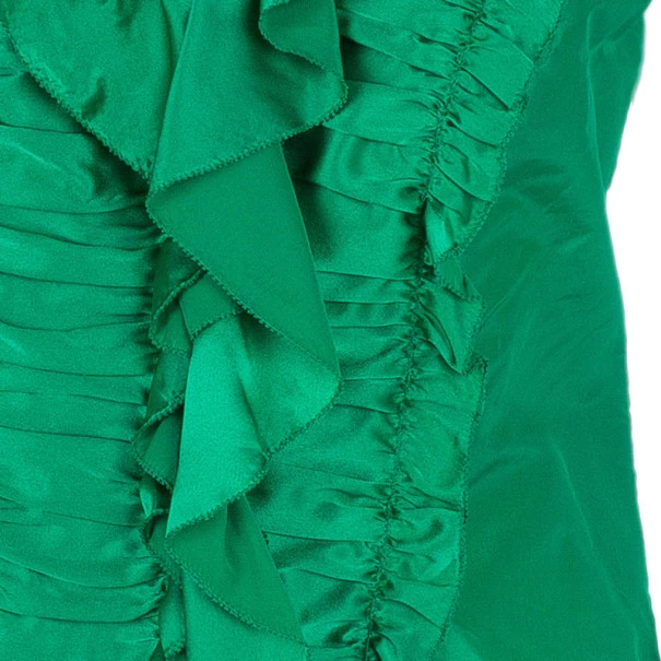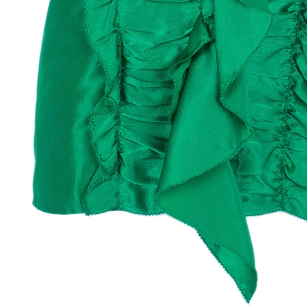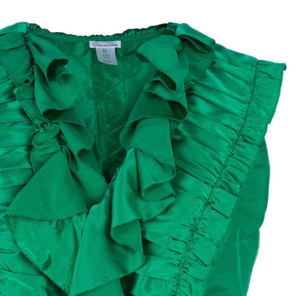 Make a true fashion statement with this Oscar De La Renta emerald ruffle satin top. It has an abundance of different ruffle detailing in the front so you can pair this creation with some plain jeans and still look fabulous.