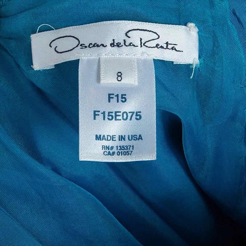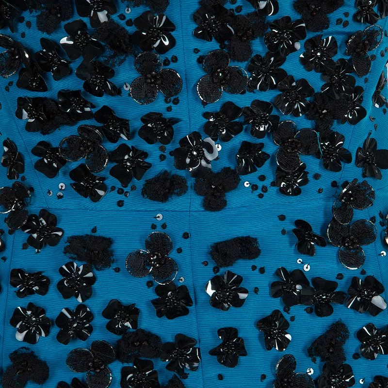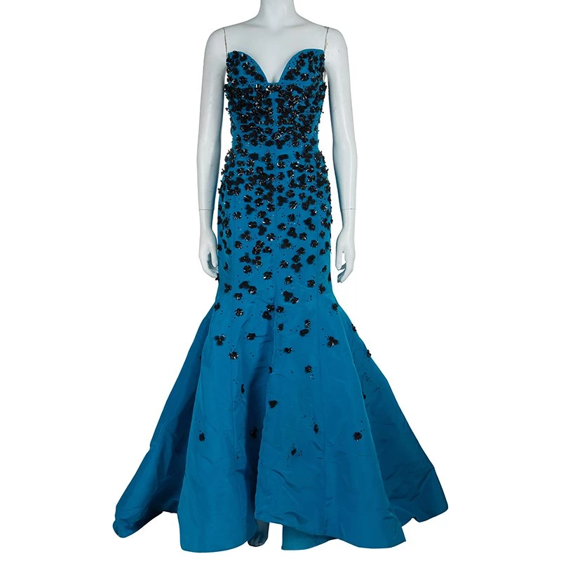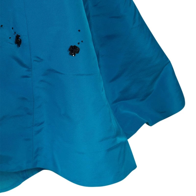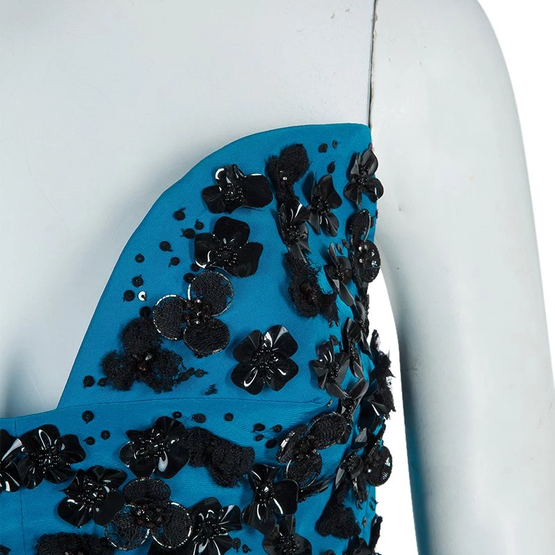 This stunning silk gown from Oscar De La Renta Fall 2015 runway collection is a floor sweeping dress impeccably crafted for an extraordinary occasion. The gown is embellished with black tulle, tiny beads and shimmering sequins – all designed in flower shapes for lustrous reflection of light. The boning sculpt with internal bustier are ideal for support and the stitched layers of skirt mesh give a dramatic volume for flamboyant occasion wear.
