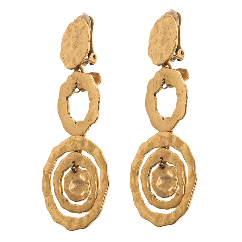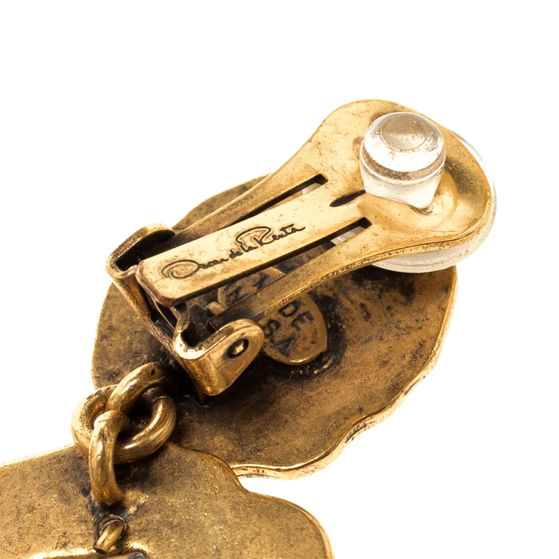 Shabby chic and modern with a touch of vintage elegance, these Oscar De La Renta long earrings are perfect to dress up or even to wear with your formal, and casual chic outfits. Constructed from gold tone metal, these earrings feature a beaten look on the flat circular discs linked together.