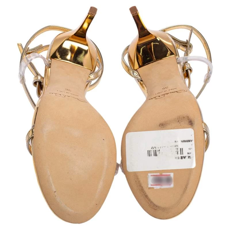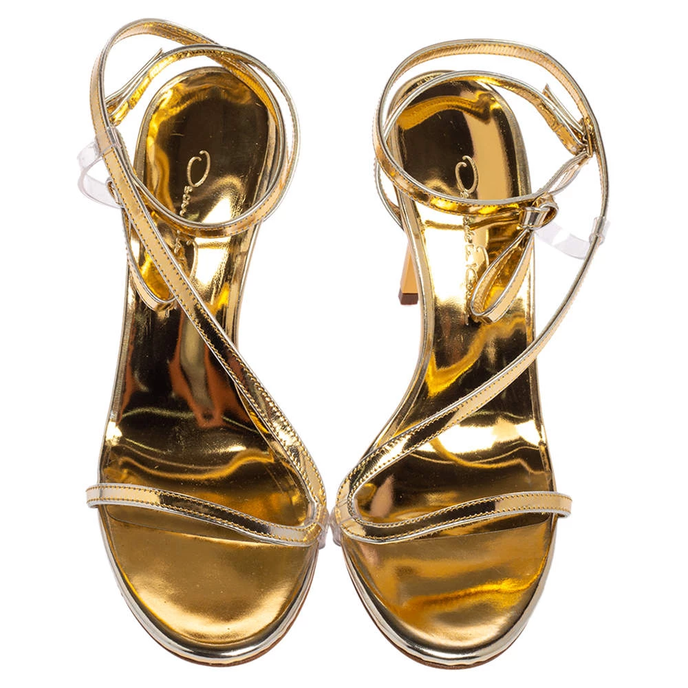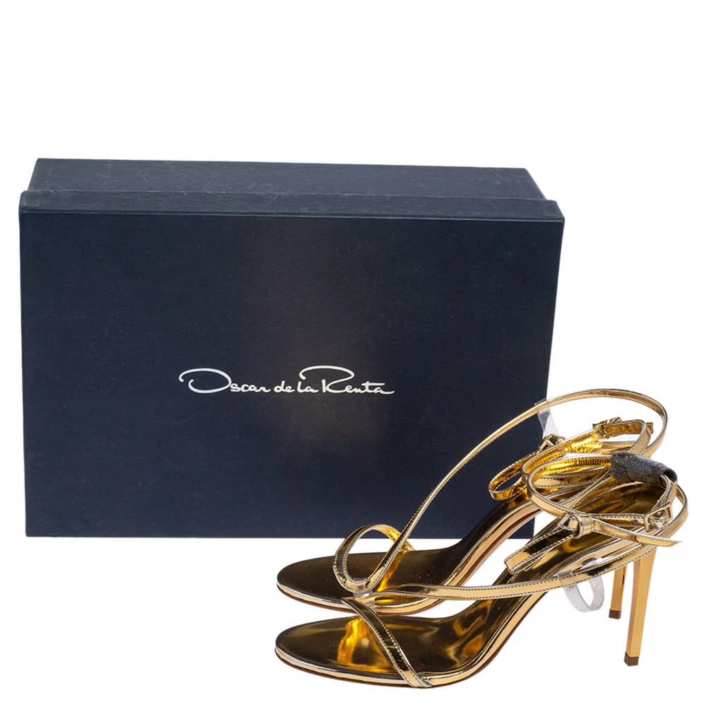 Choose these gold leather sandals by Oscar de la Renta for an elegant update. This pair of sandals features thin straps, ankle buckle closure, leather insoles, and slim heels to help you create a stunning silhouette.