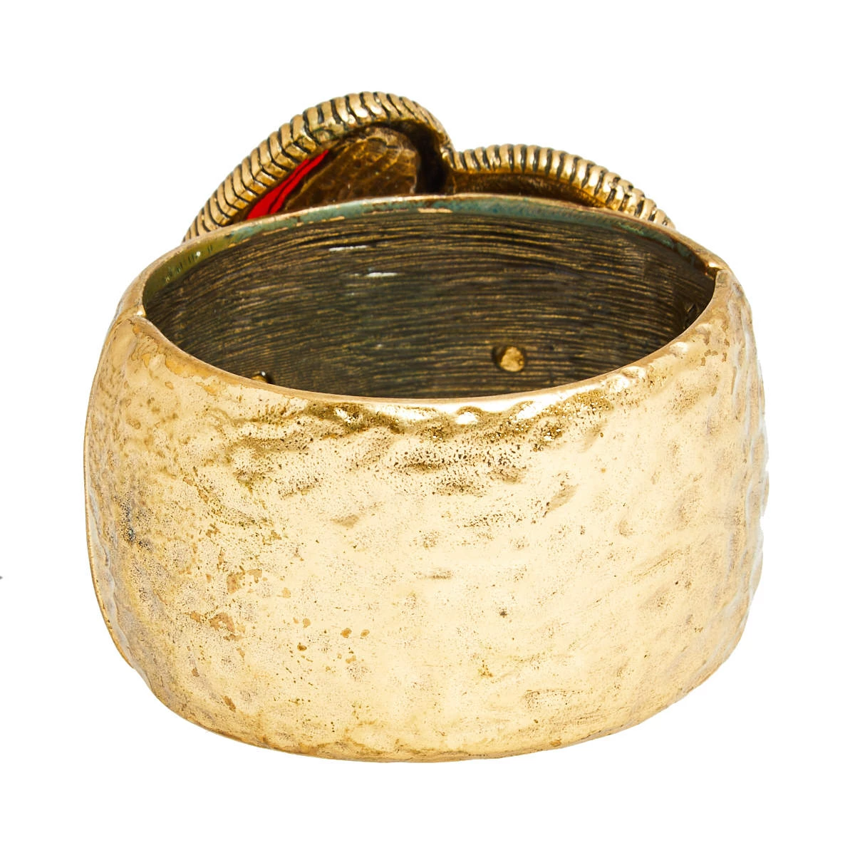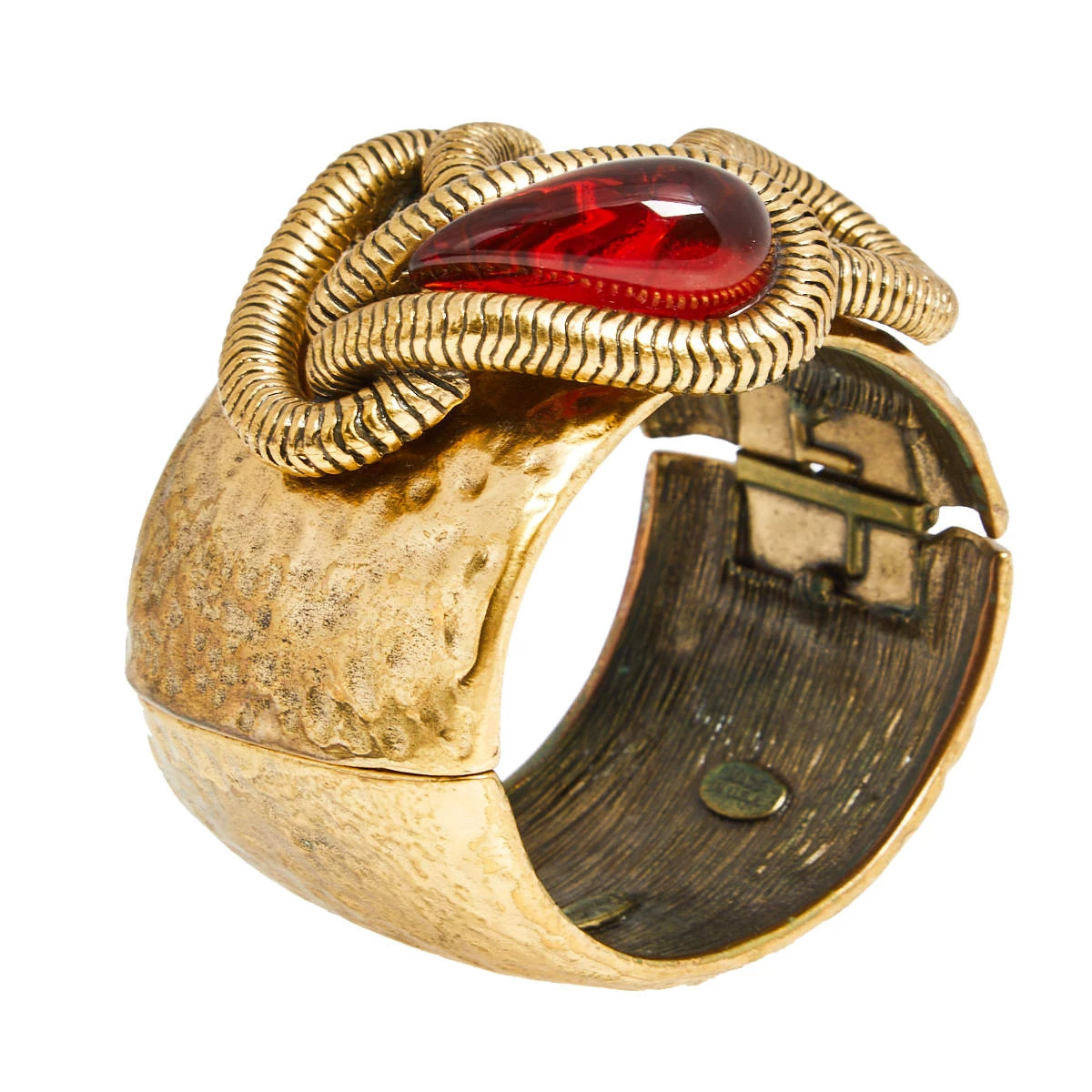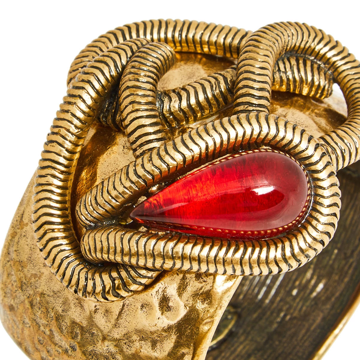 Constructed using gold-tone metal in a cuff design, this Oscar de la Renta bracelet is sure to fit well and look great on your wrist. It is highlighted with a coiled accent and a red crystal for a stylish contrast.