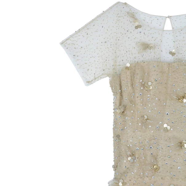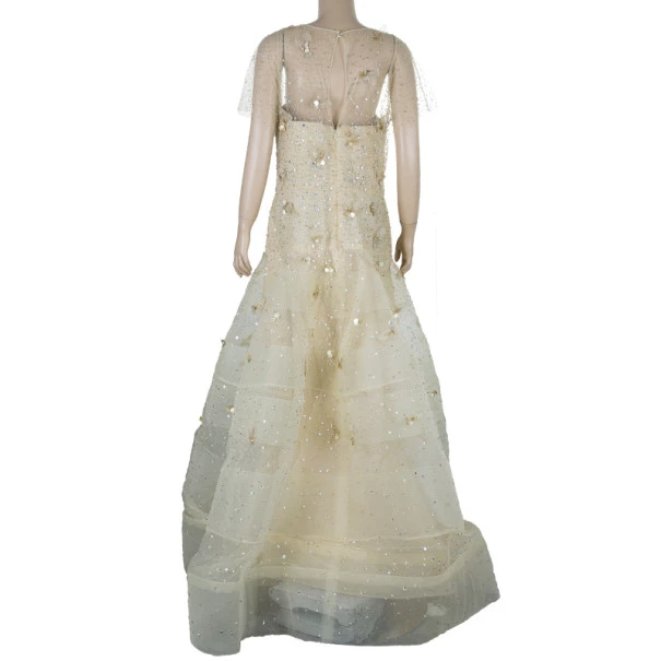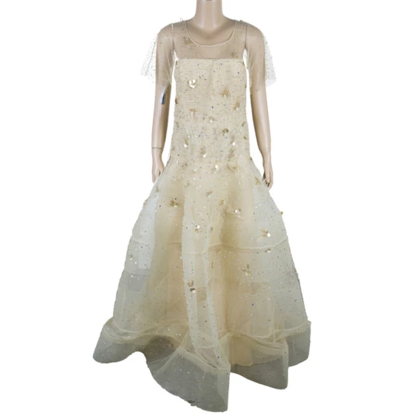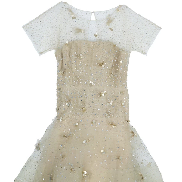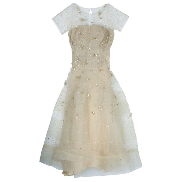 Princess-like and dreamy, this Oscar de la Renta dress is a beauty. Its dainty golden pleated tulle is designed with a sheer layer embellished and featuring a round neckline and short sleeves. The strapless body gives it a darker shade and accentuates the embroidery and gives them a gold illusion.