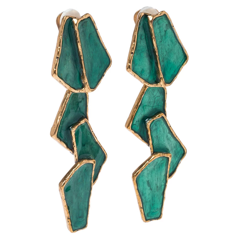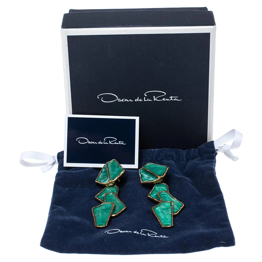 Crafted in gold-tone metal, these earrings by Oscar de la Renta are cute and elegant. They feature a unique design enhanced with green enamel detailing. These earrings are equipped with clip-on fastenings for easy donning.