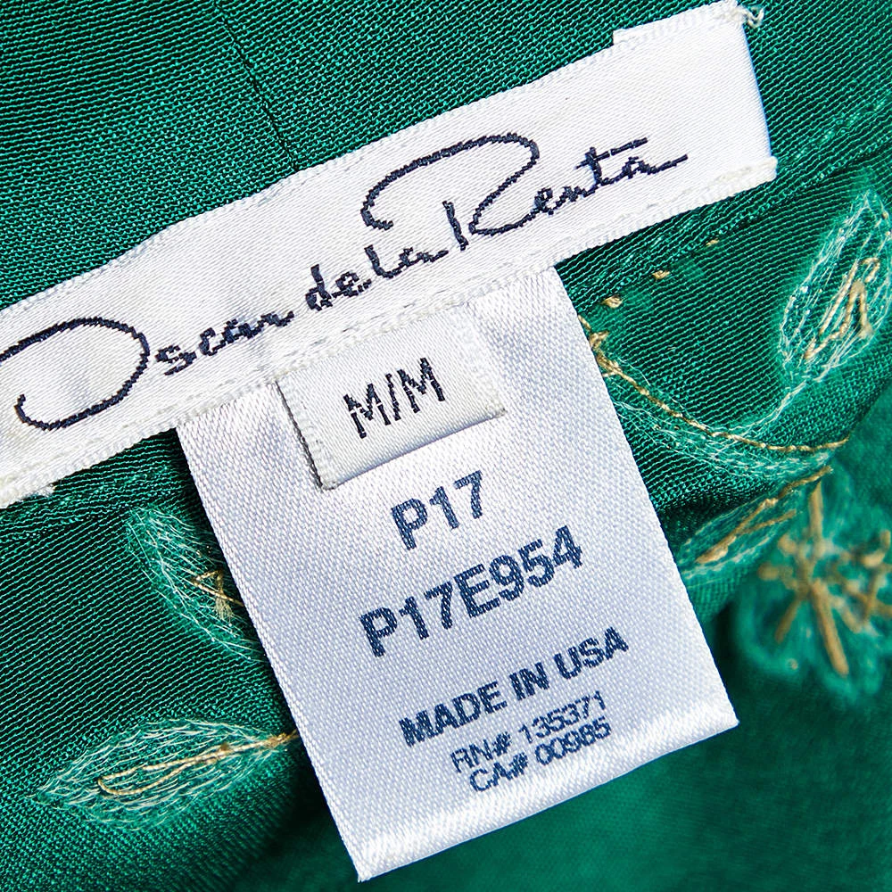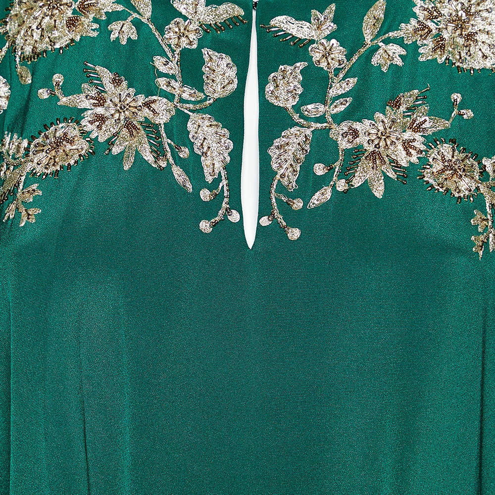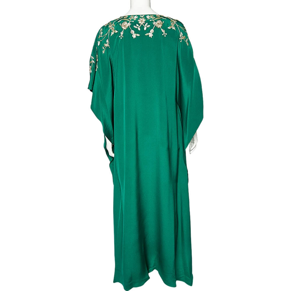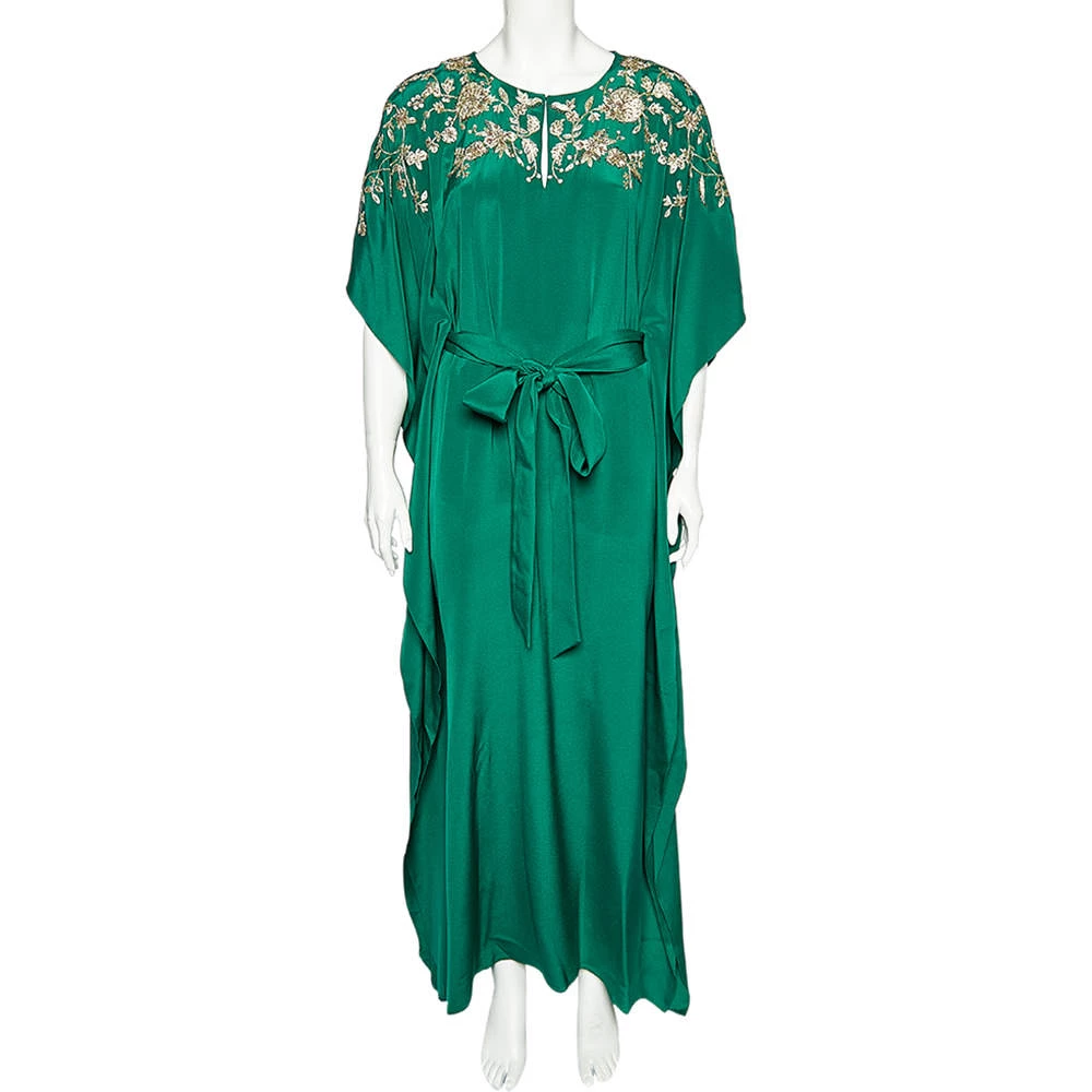 Overlaid with plush silk and adorned with delicate detailing, this kaftan dress will incorporate an element of color and style to your appearance. This dress from Oscar de la Renta has been beautifully tailored using green silk fabric with intricate embellishments and belted detail added to its shape. Refresh your summer wardrobe by wearing this impeccable kaftan dress.
