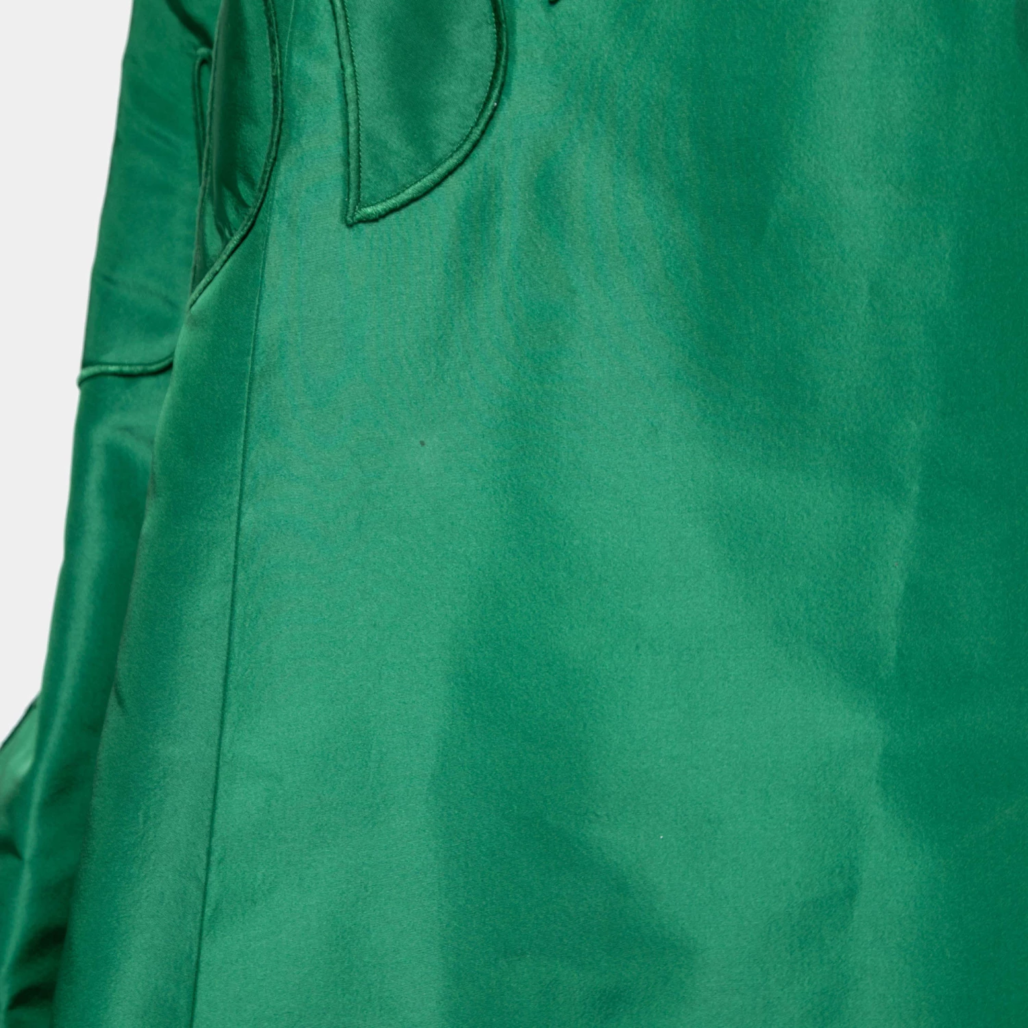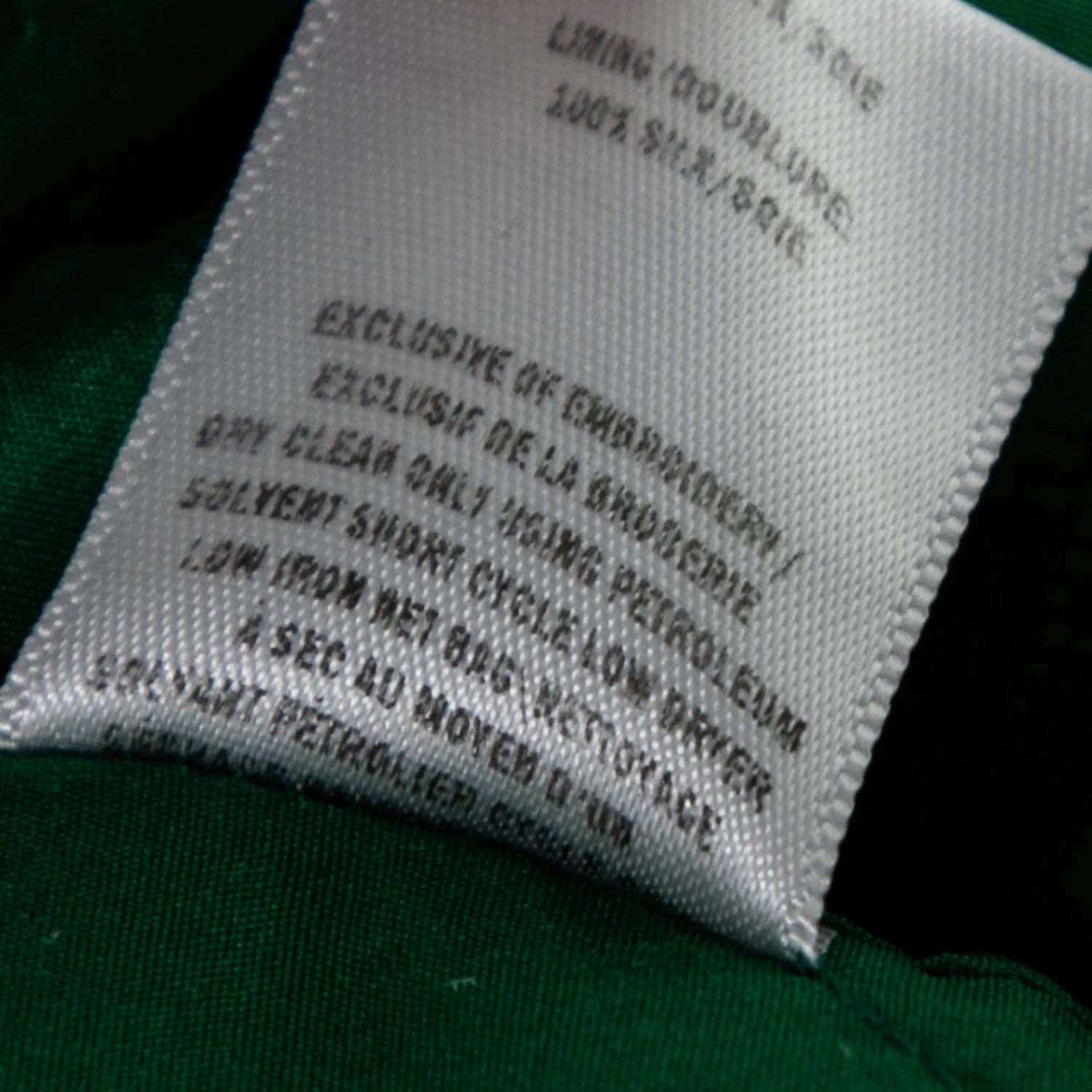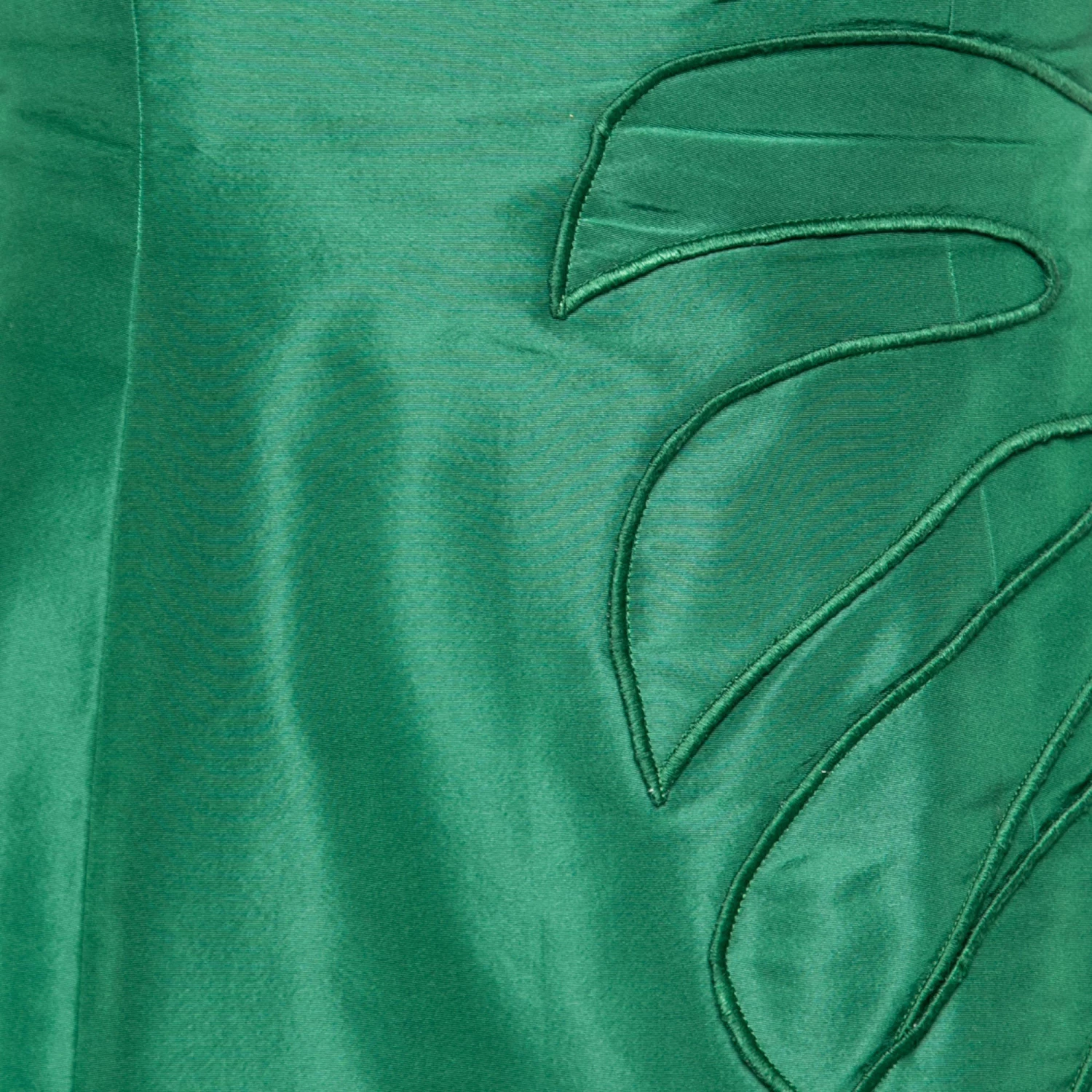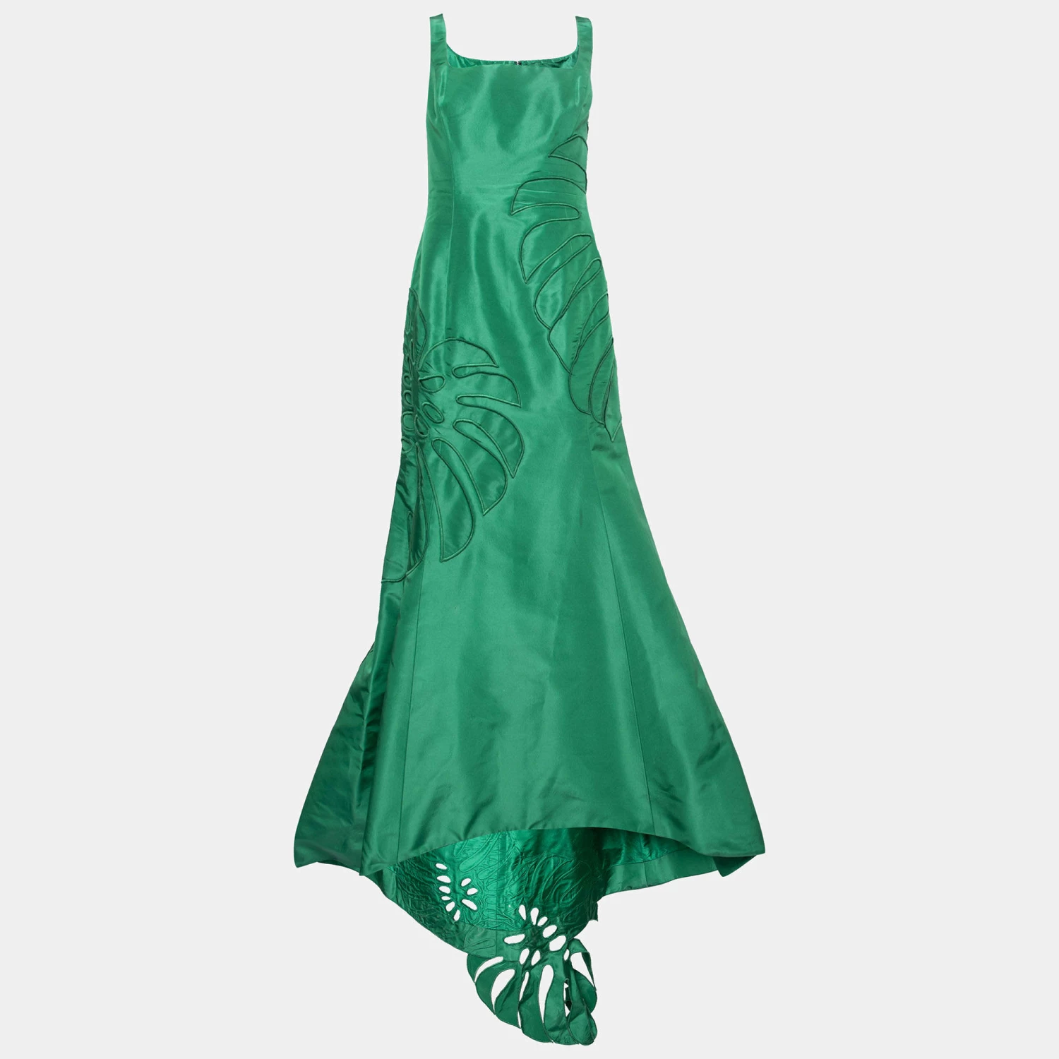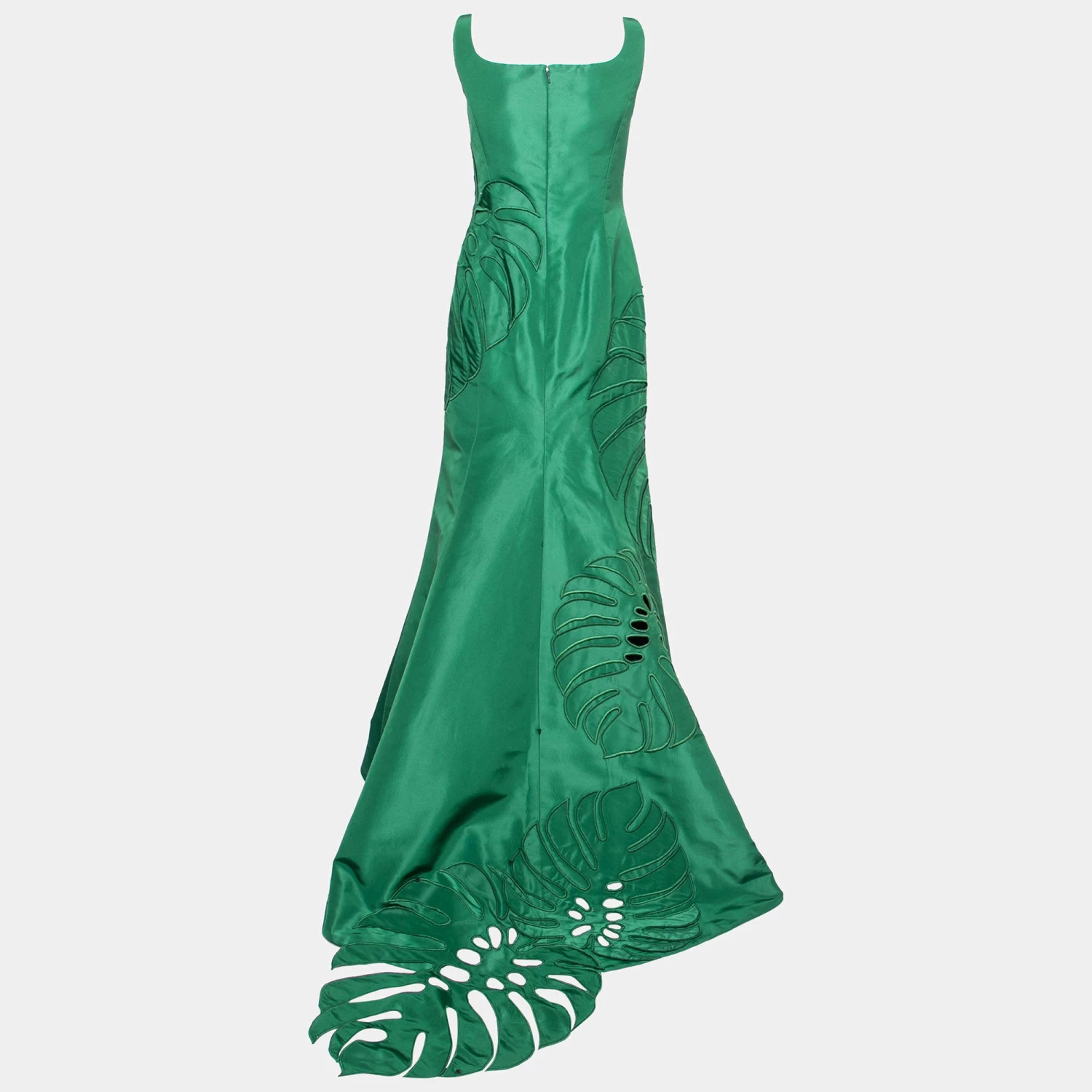 Your love for fashion and exquisite pieces becomes evident the minute you cloak this fabulous Oscar de la Renta creation. Displaying a green hue complemented with palm-leaf cut-outs, this sleeveless gown has a trumpet-style silhouette and a leaf-detailed trail. Take out your finest jewelry with this gown to attend an evening event or a gala.