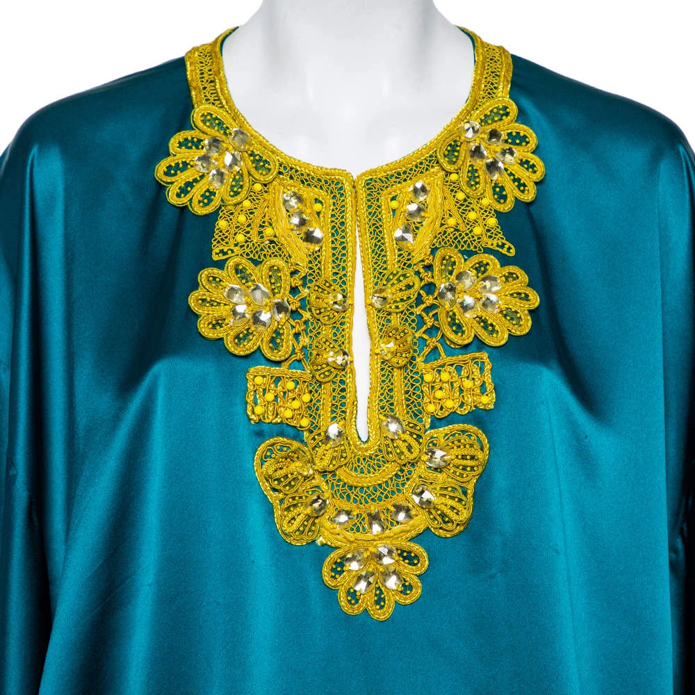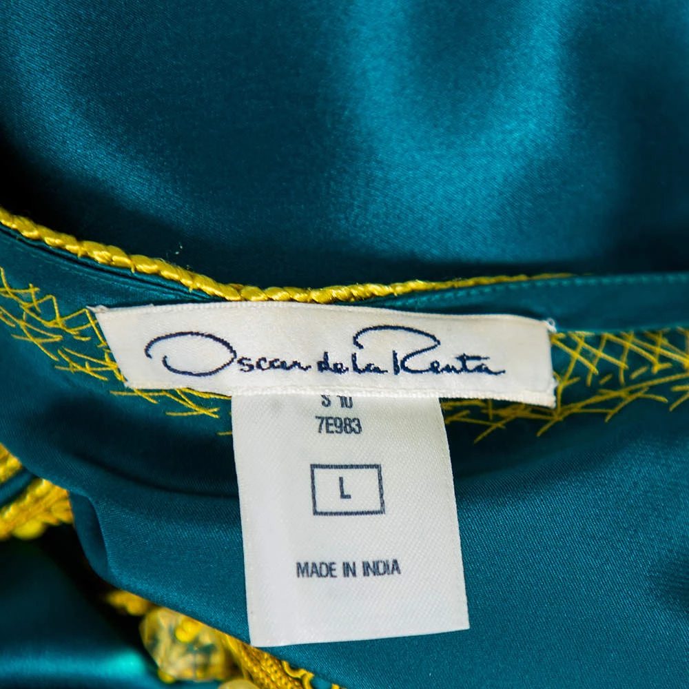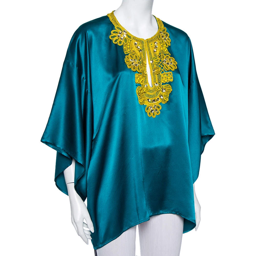 This Oscar de la Renta oversized top is cut from green satin and contrasted with yellow around the neckline. Pair it with comfortable pants and stilettos or comfortable kitten-heel slides.