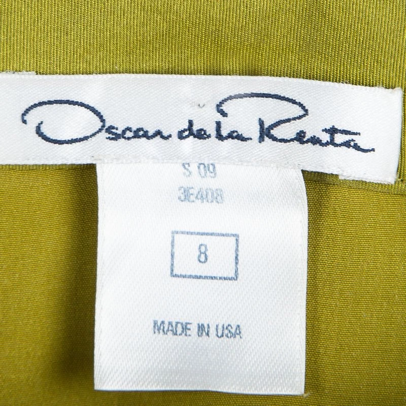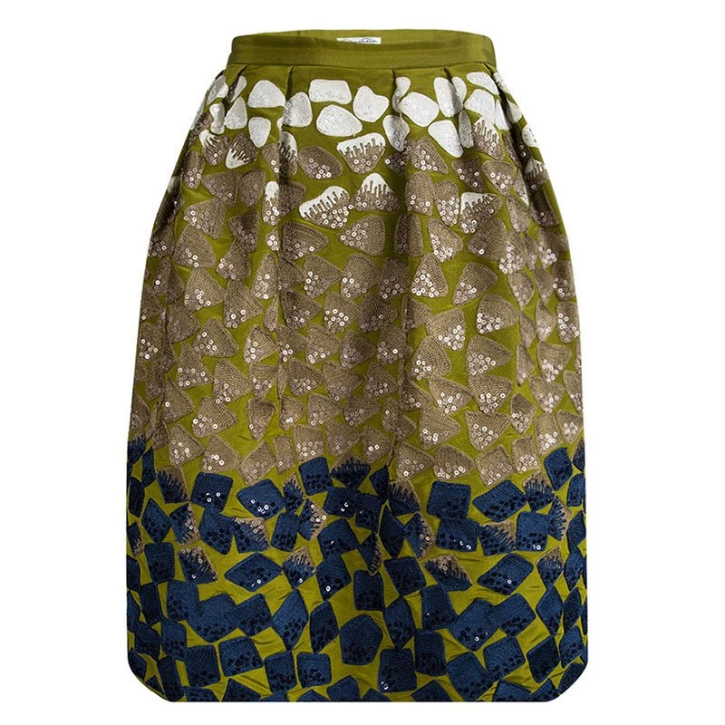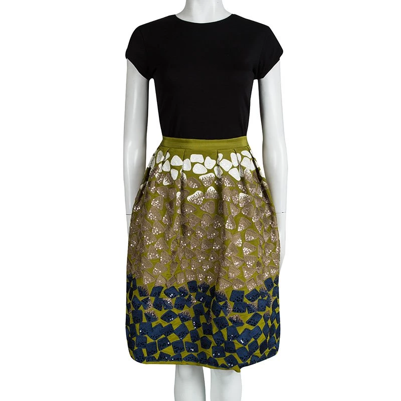 Oscar De La Renta create magic with their clothes and make every girl feel like a million bucks. This green silk pleated skirt is adorned with multi colored patches of sequins to create a dramatic effect perfect for an evening soiree, with its hard to miss details. The waist band sits high on the waist for a curved silhouette while the skirt balloons out for the perfect ball gown effect.