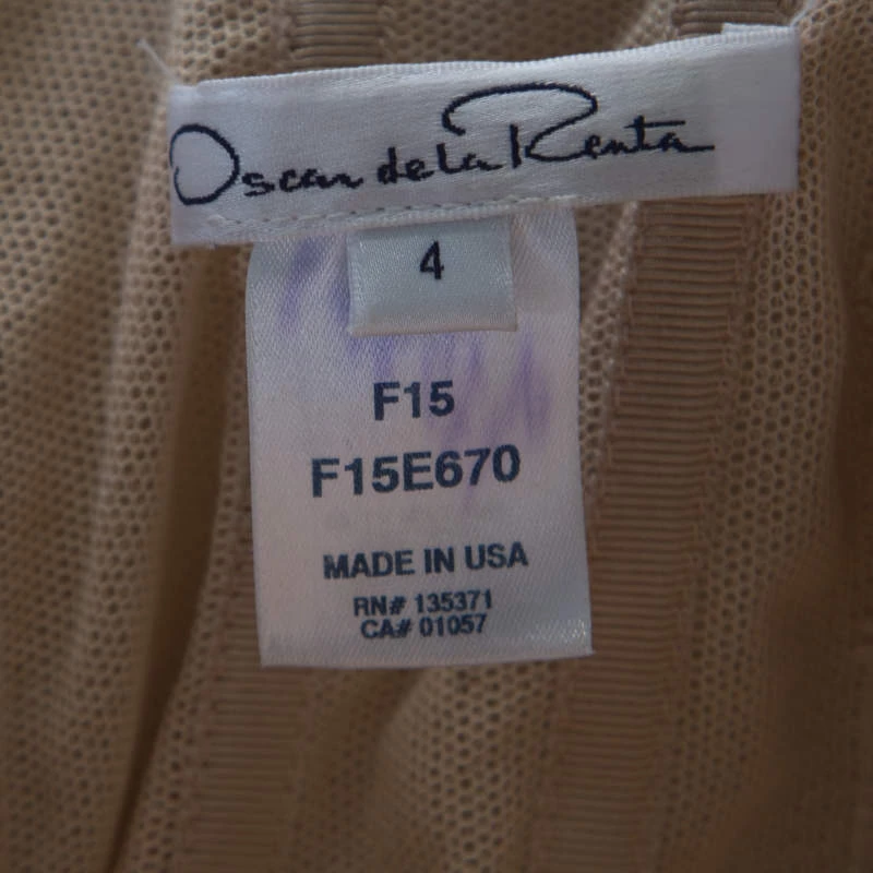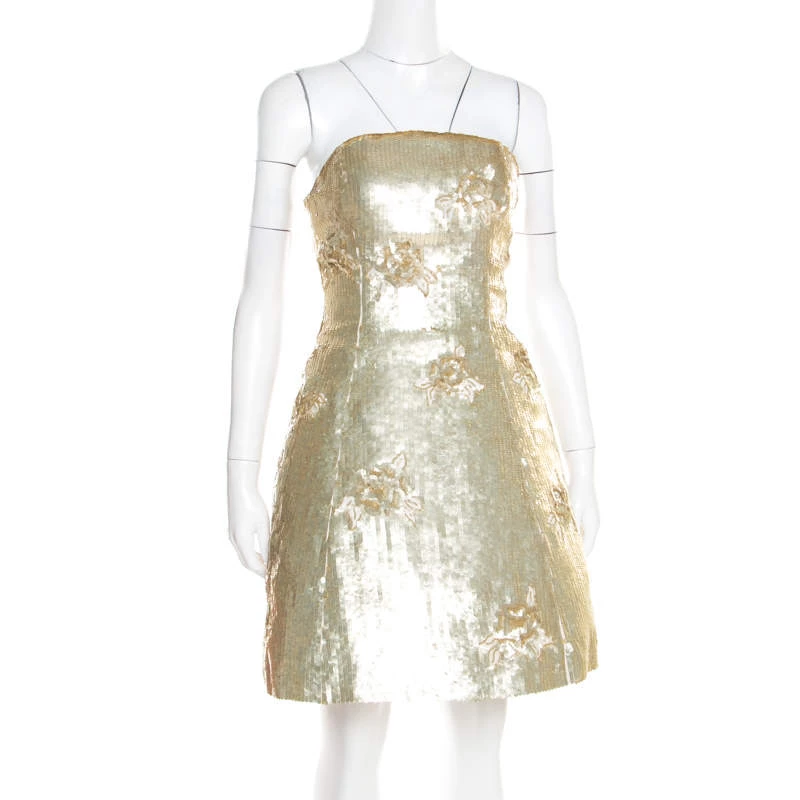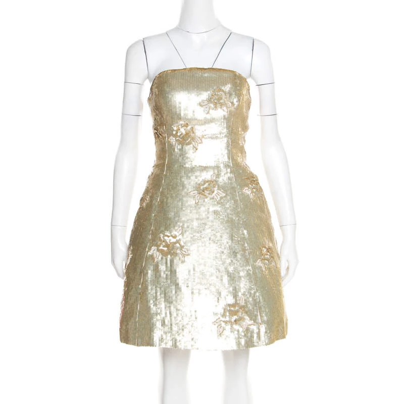 Make a unique style statement wearing this ravishing dress from the house of Oscar de la Renta. Wear this gold number with your favourite accessories for a glamorous yet edgy look. Ladylike and dressy, this dress is crafted from silk and is adorned beautifully with sequins all over. Having a strapless silhouette with a fitted bodice flared skirt, the outfit is secured by zip fastenings at the rear that further contribute in offering a flattering fit. This gorgeous creation is a treasure in any woman’s collection.