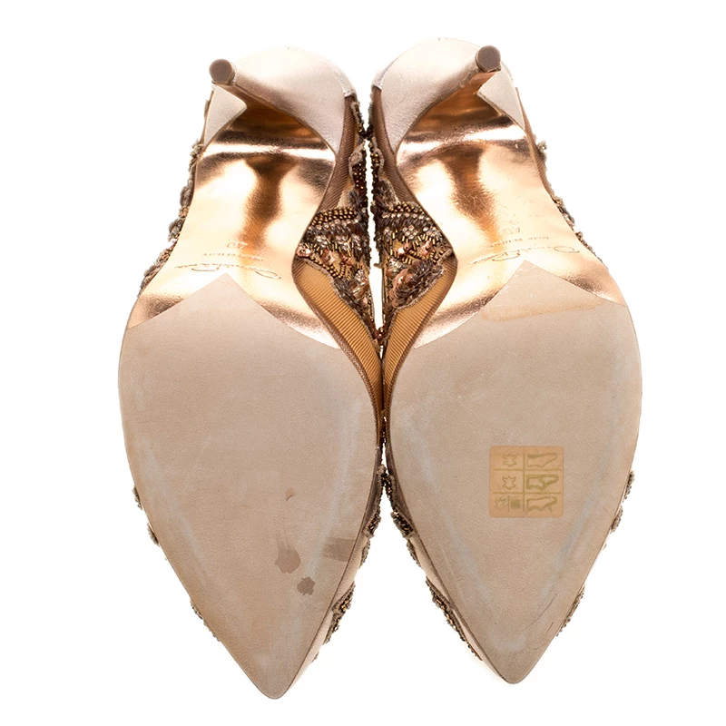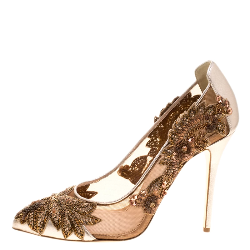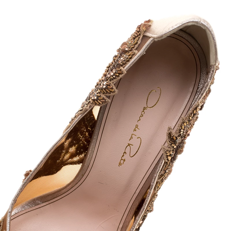 Some shoes protect our feet, but some shoes just make one feel magical at every step. These Oscar de la Renta pumps fall into the magical category as they are simple spell-binding. Their mesh exteriors are detailed with leather trims and embellishments laid in an artistic manner. Pointed toe boxes and 11.5 cm heels make them ready to be yours.