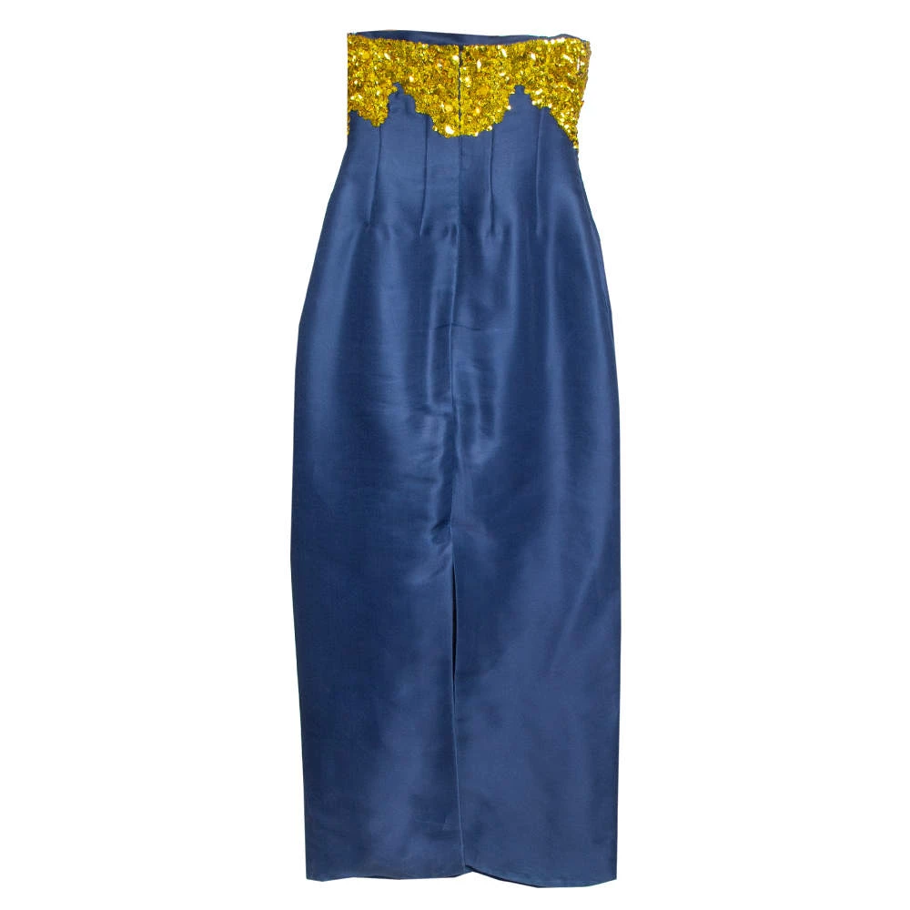 Look dignified and make a statement when you don this ethereal Oscar de la Renta gown from the label’s 2018 spring collection. in a midnight blue hue, the gown is designed with contrasting sequin embellishments all over the strapless bodice. It is cut from silk in a structured silhouette and is complete with a zip fastening at the rear.