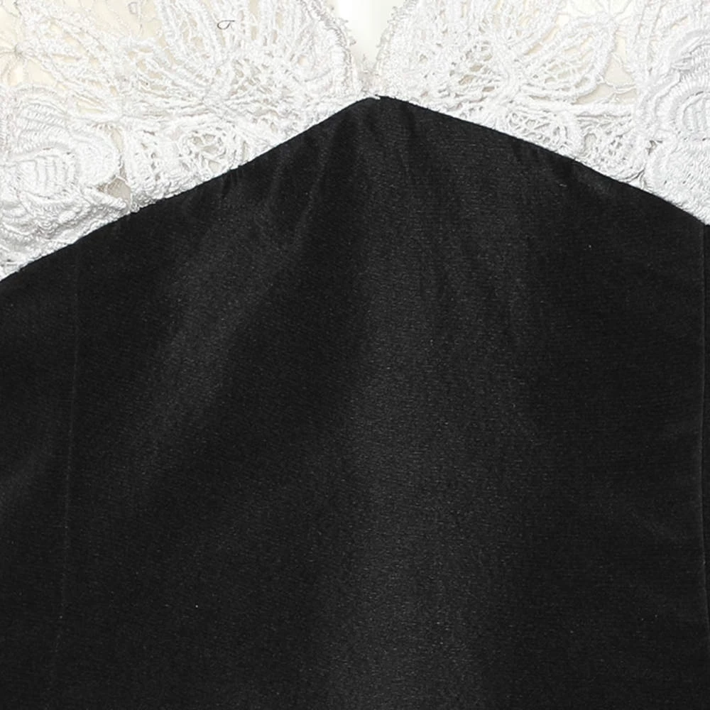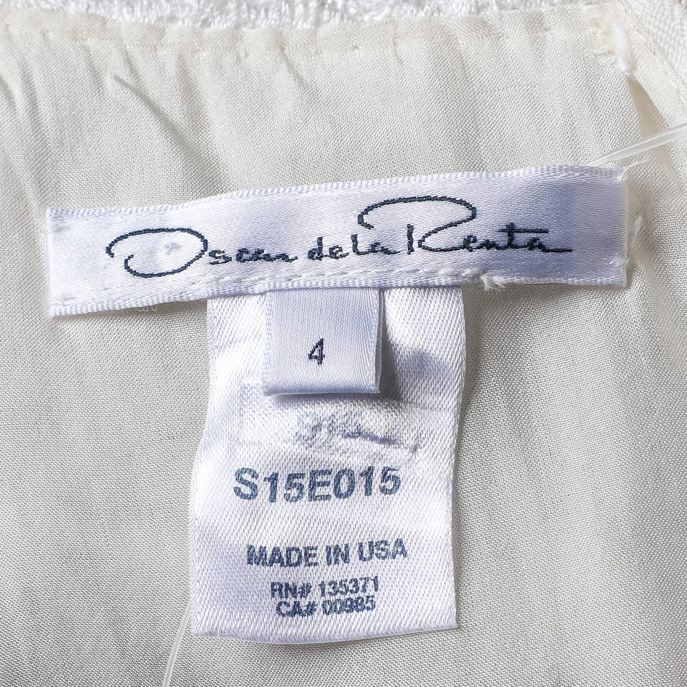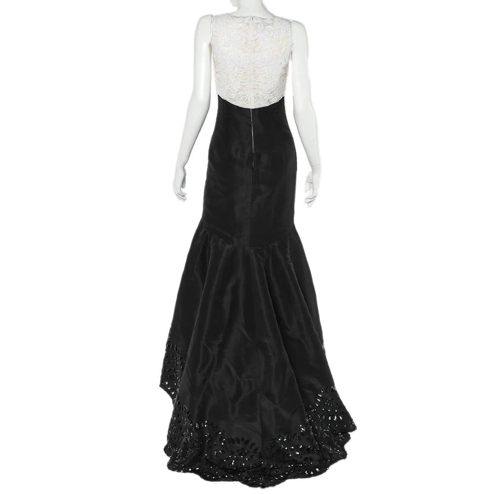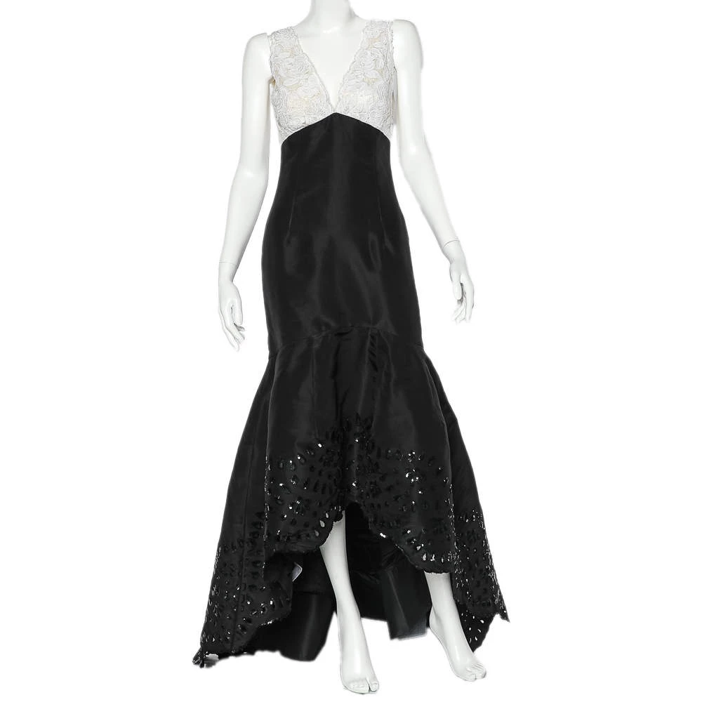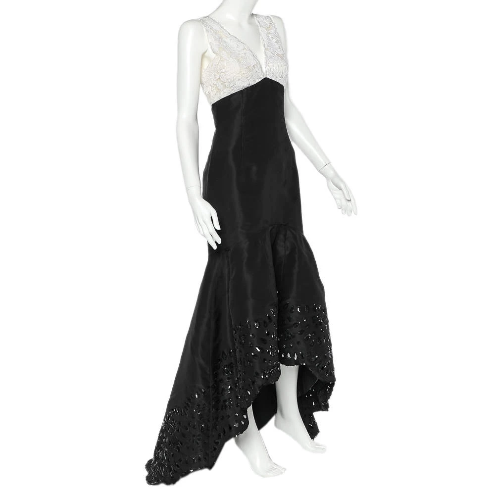 Clean-cut silhouettes with a dreamy touch are a signature of Oscar de la Renta, and this gown shows off the precise lines and fit so beautifully. It is a marvelous design, achieved by sewing quality fabrics into a mesmerizing shape. The bodice is constructed using lace and the contrasting skirt is constructed to fall in a flared style with a high-low hemline.