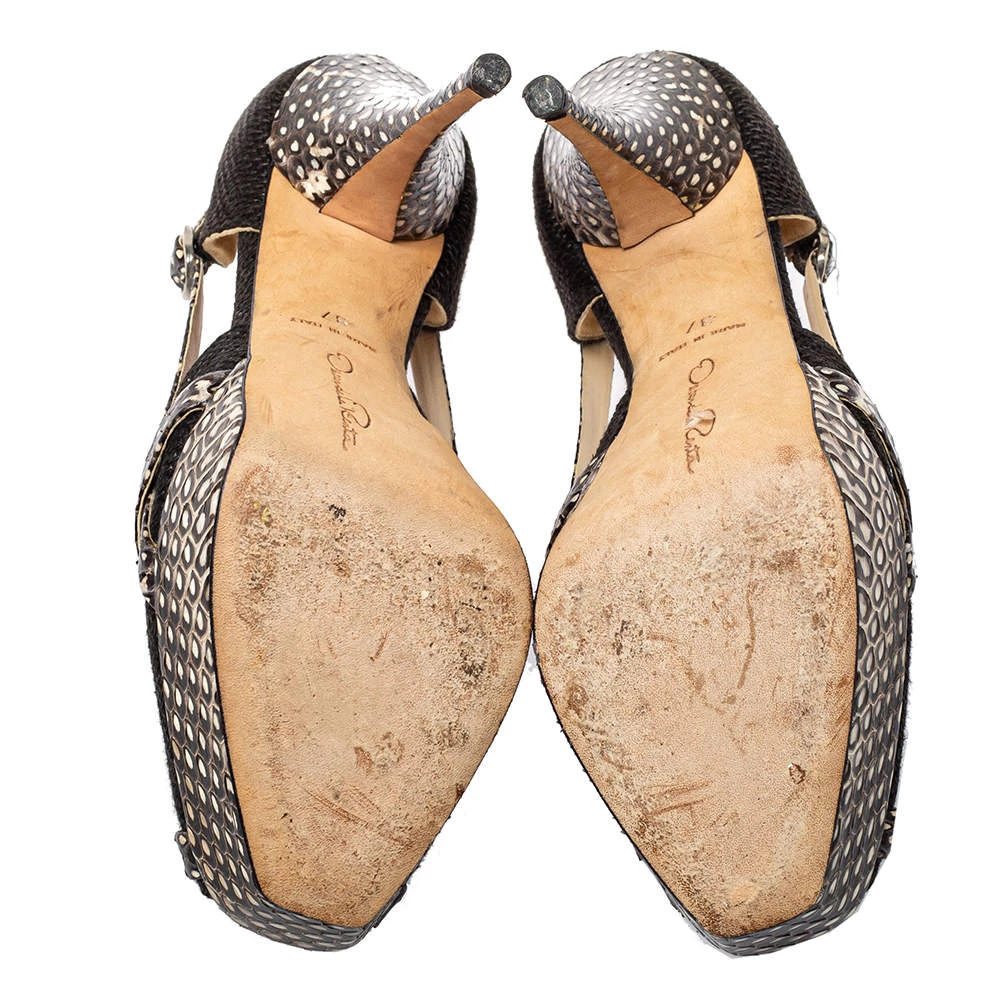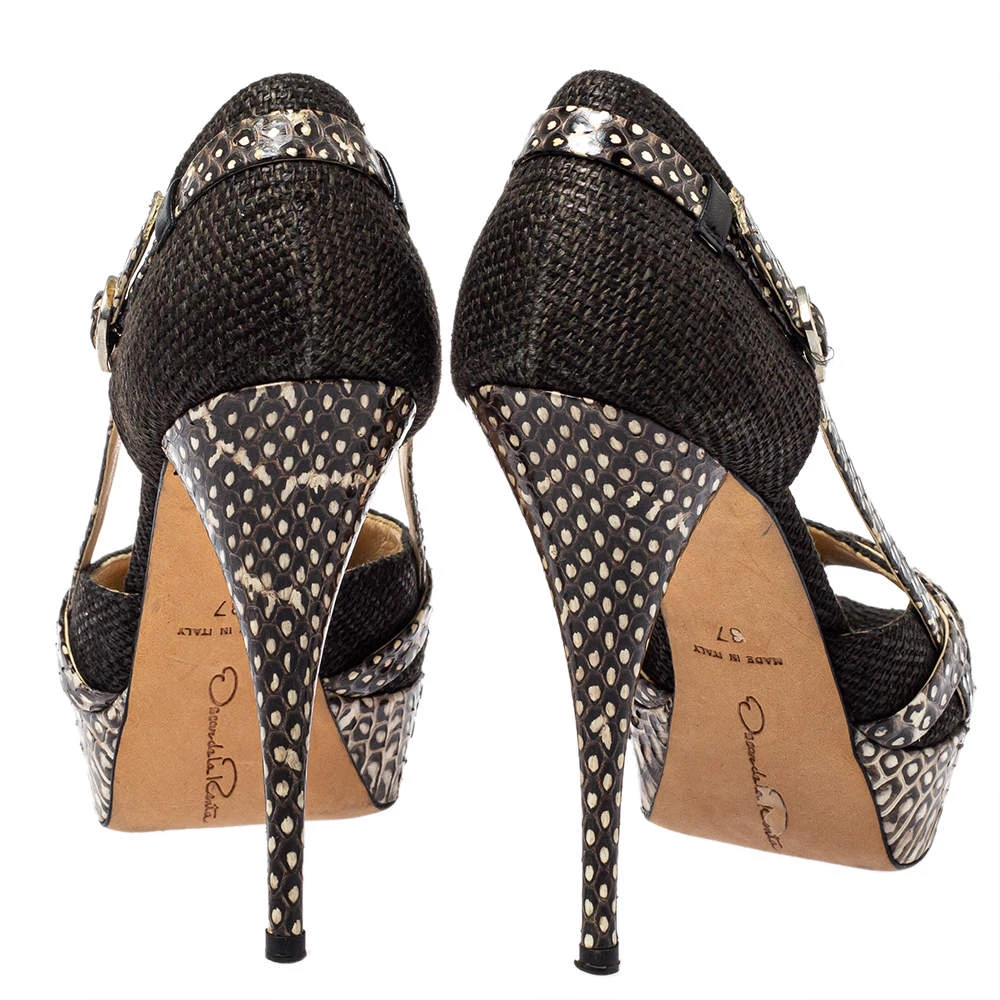 This stunning pair of pumps from Oscar de la Renta is sure to add some class to your outfits. The peep-toe pumps have been crafted from raffia and python leather and they come with buckle strap details on the sides and comfortable cork insoles. They are complete with 12 cm heels and solid platforms. NOTE: AVAILABLE FOR UAE CUSTOMERS ONLY.
