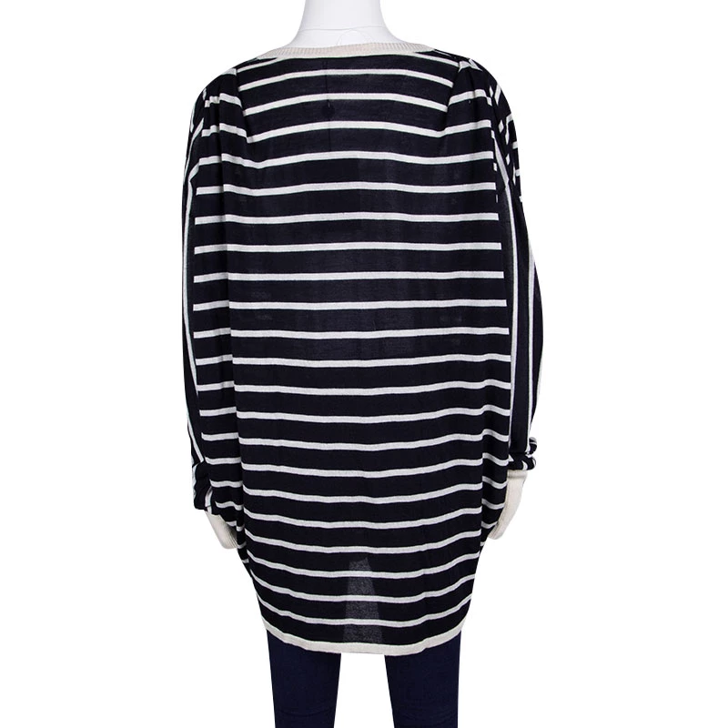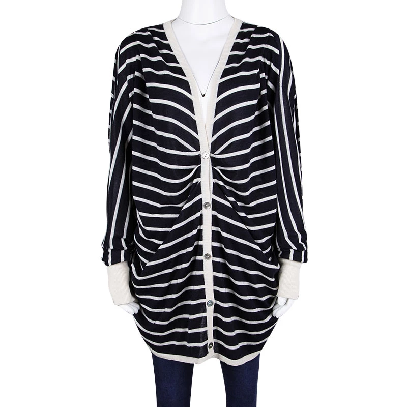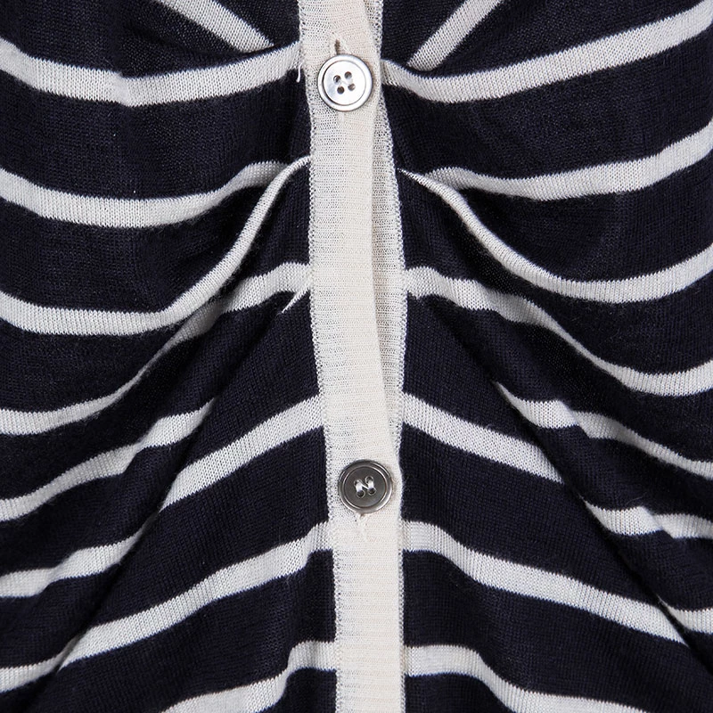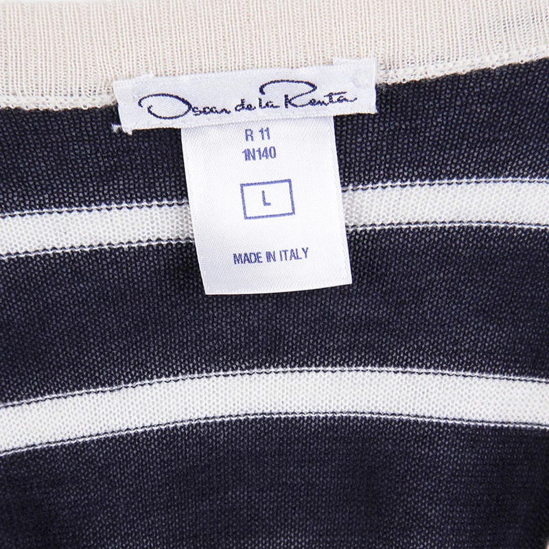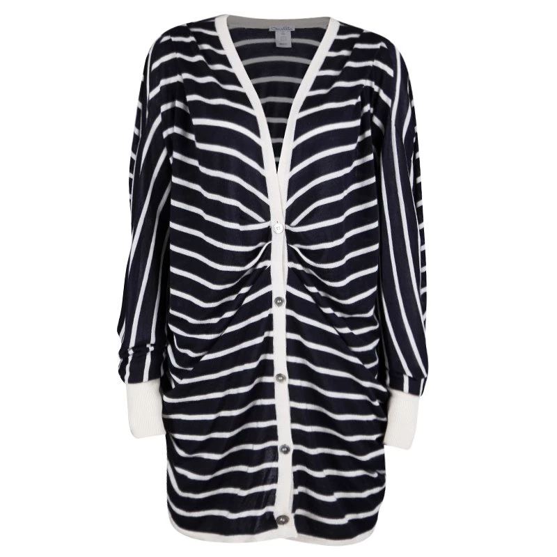 Well-crafted and absolutely gorgeous, this cardigan is from Oscar de la Renta. It features long sleeves, front buttons, and stripes in navy blue and white. Styled to perfection, this piece is wonderful enough to help you keep warm and look ultra stylish.