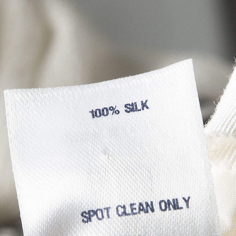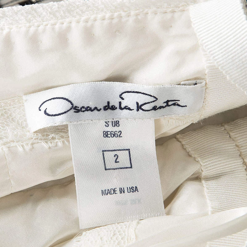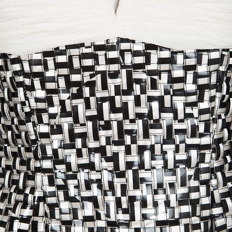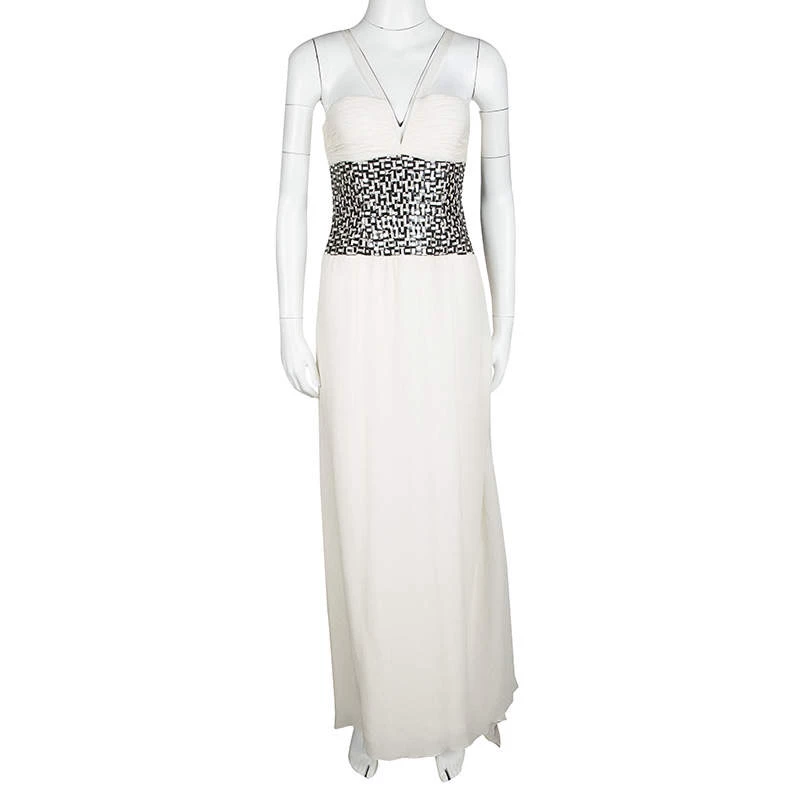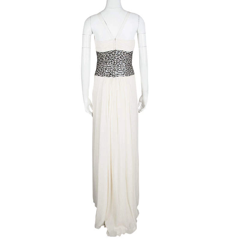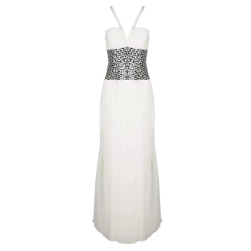 Designed in the most gorgeous off white silk fabric, this Oscar De La Renta gown will instantly make you ready for the special event. Featuring halter straps with V cutout at the top, this gown is accented with black and white basket weave embellishment along the waist and the ruched bodice to complete the look.