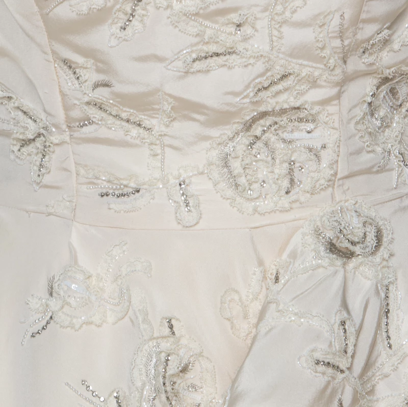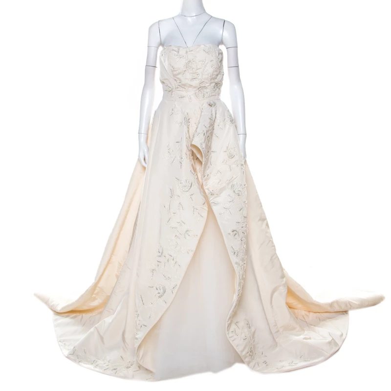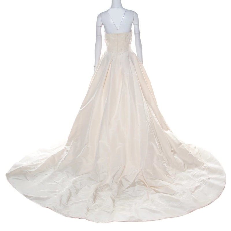 Oscar de la Renta’s signature touch of elegance is wonderfully seen in this wedding gown. It is an exquisite choice for brides-to-be. This masterpiece comes in a dreamy design. The strapless gown features embellishments of sequins and beads and layers that cascade down in a beautiful manner. It is secured by a zip closure and the flared skirt releases a circular train.