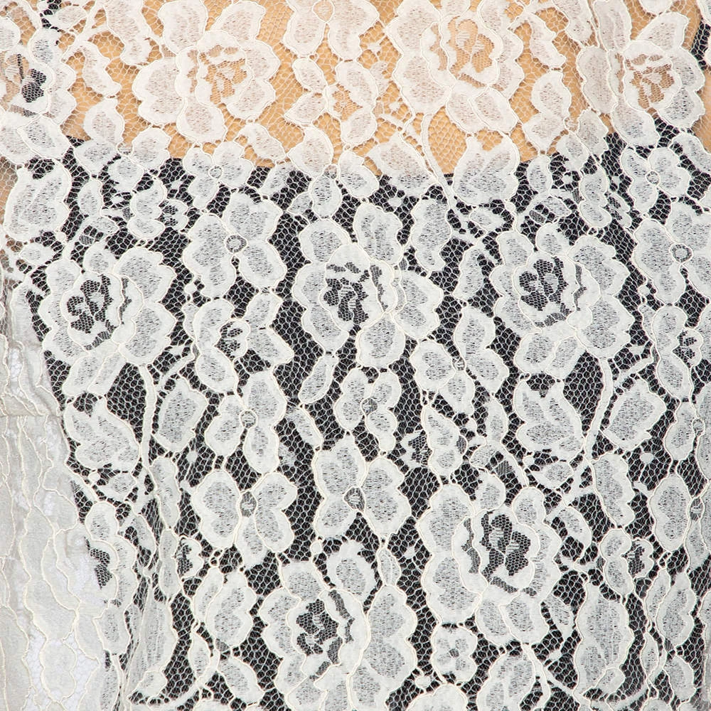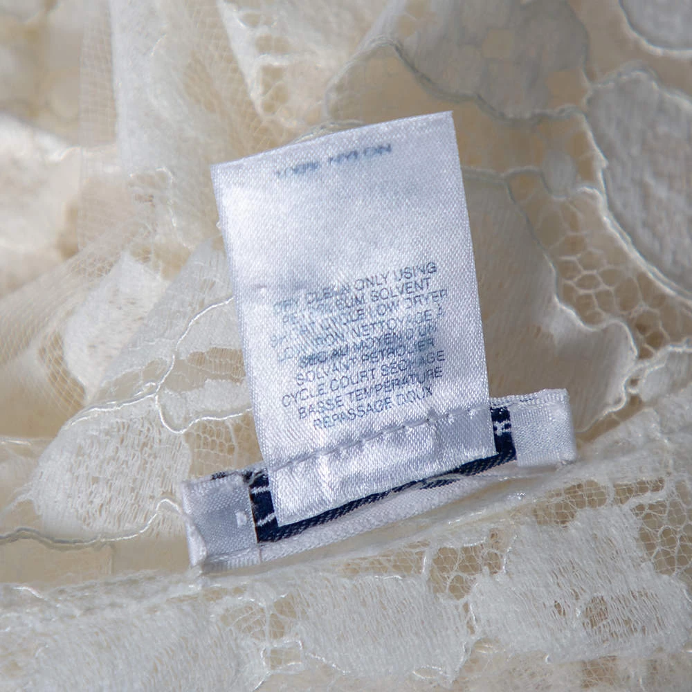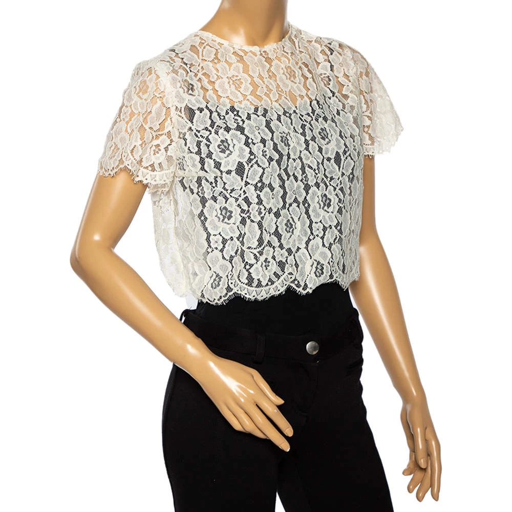 This crop top from Oscar de la Renta is stunning and perfect for special occasions. It has been crafted from off-white lace in a flattering style. It has short sleeves, an open back with a tie detail, and a good fit.
