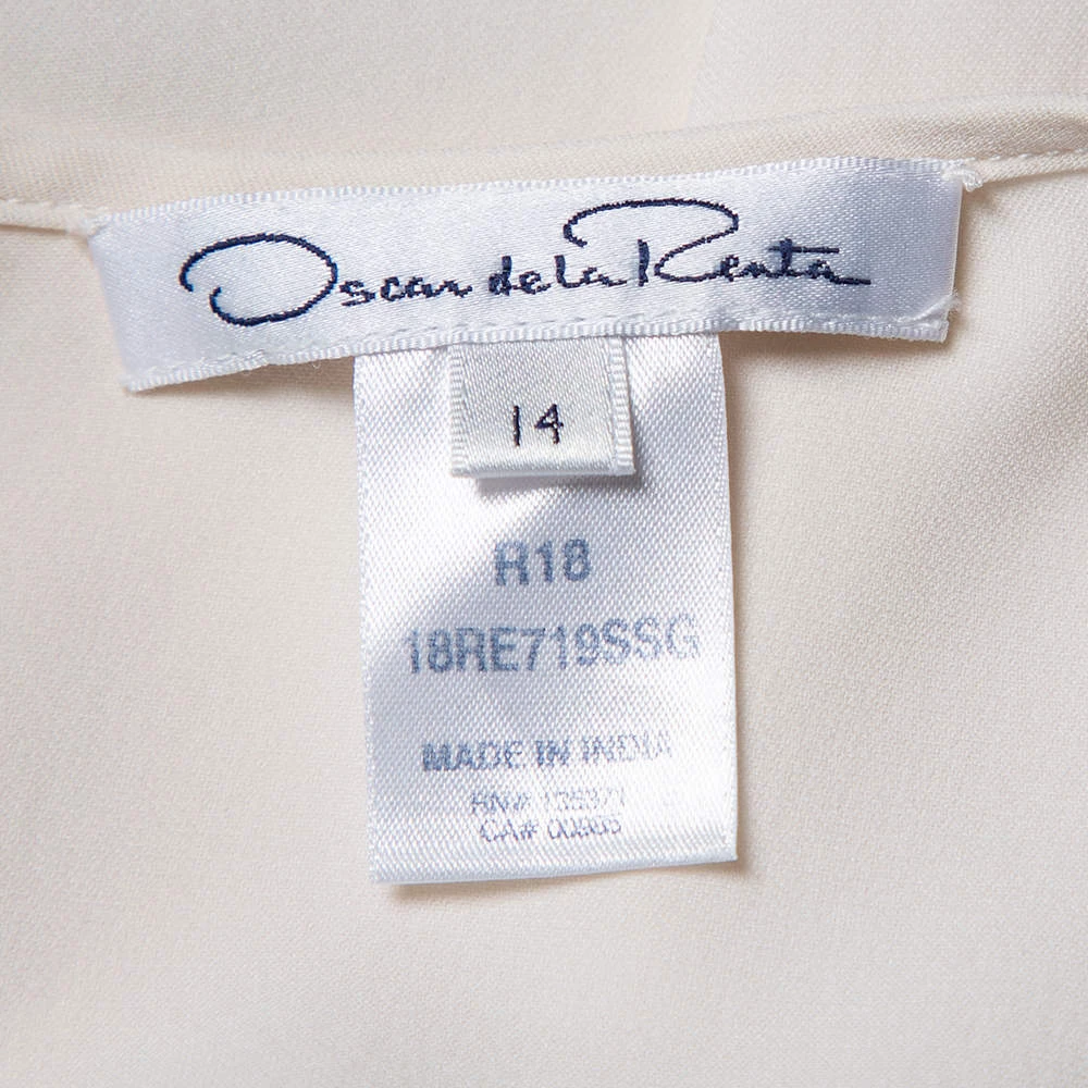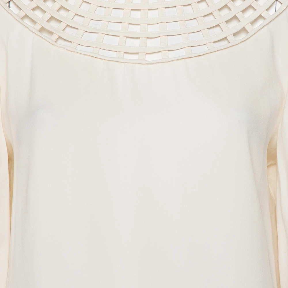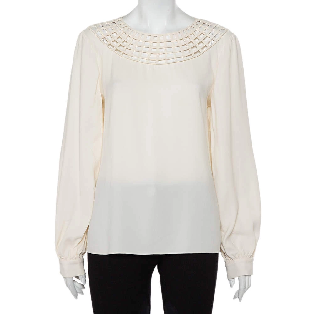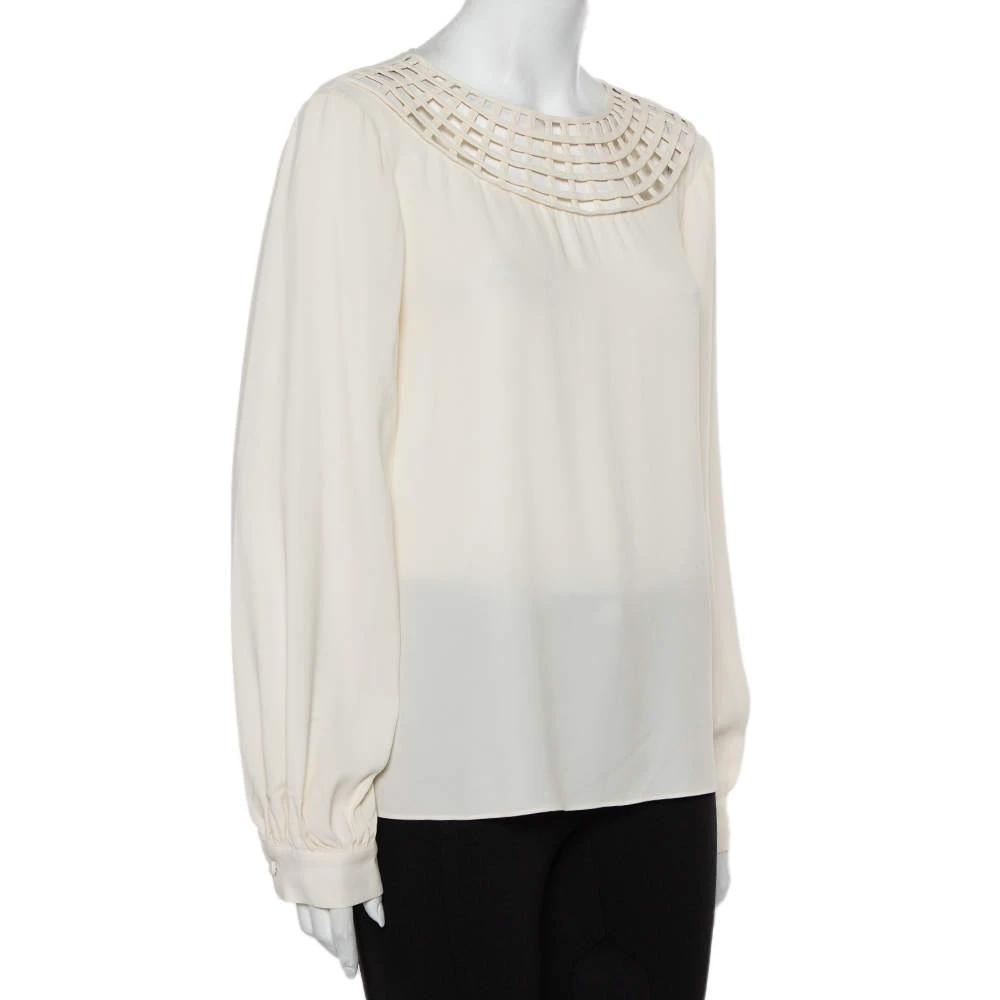 In a wardrobe of basics, this Oscar de la Renta top is a breath of fresh air with its understated yet interesting design. This luxurious top flaunts an off-white hue along with a grid-like cutout pattern on the neckline. This exquisite full-sleeved top is the perfect blend of comfort and style.