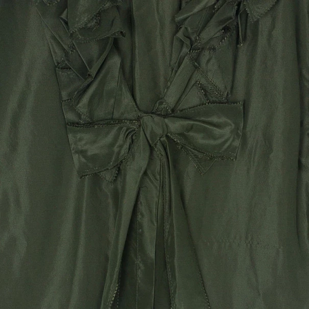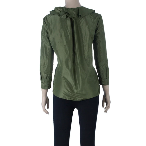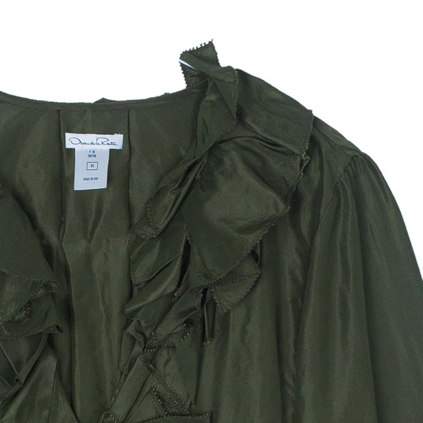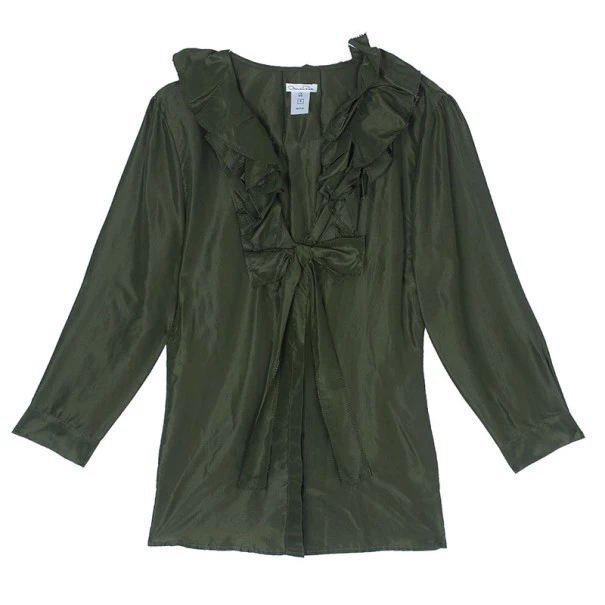 Keep it chic in this Oscar de la Retna top. Made from silk, this beauty is designed with a classy smooth top with a feminine shine off its olive green shade. This top features three-quarter sleeves, a ruffled neckline with a dainty bow, as well as a button-up closure.