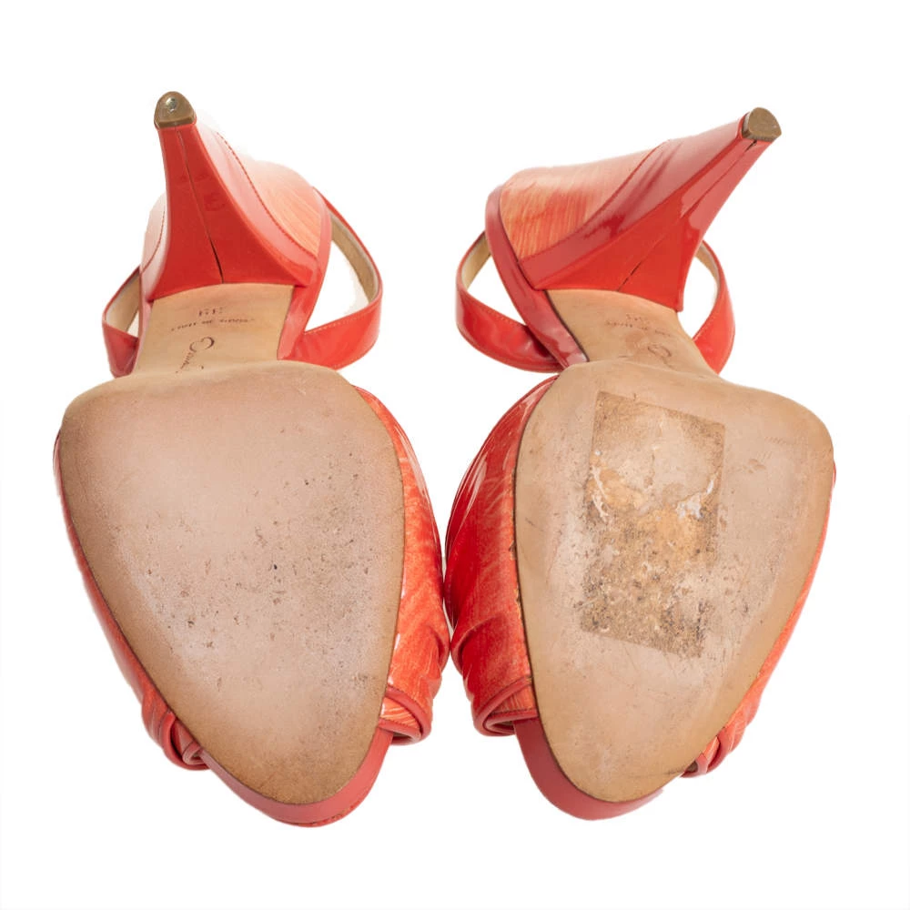 These stylish sandals come from the house of Oscar de la Renta. Crafted in Italy, they are made from quality patent leather. They are styled with knotted vamp straps, open toes, slingbacks, and high, conical heels. They are finished with leather lining, insoles, and soles.