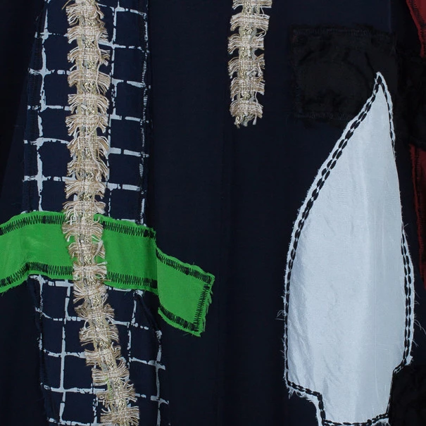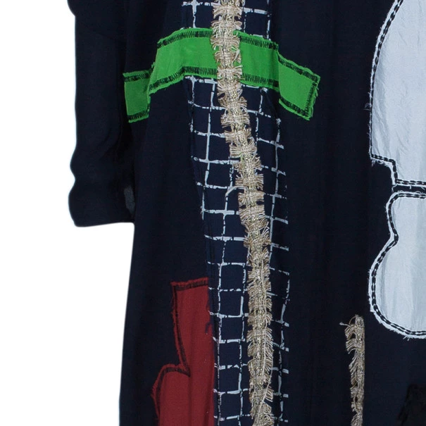 Make a statement with this kaftan during a cool summer party. Crafted from pure silk, this multicolored kaftan showcases patchwork and exclusive embroidery creating a magnificent design on the entire apparel. This loose, free flowing dress features full sleeves and a round neckline with a keyhole pattern.