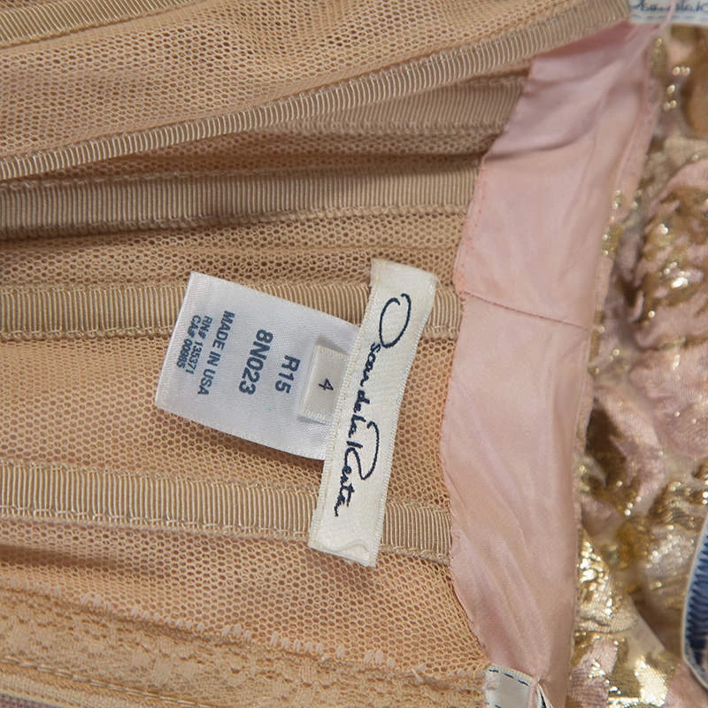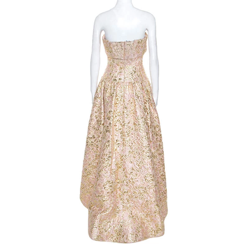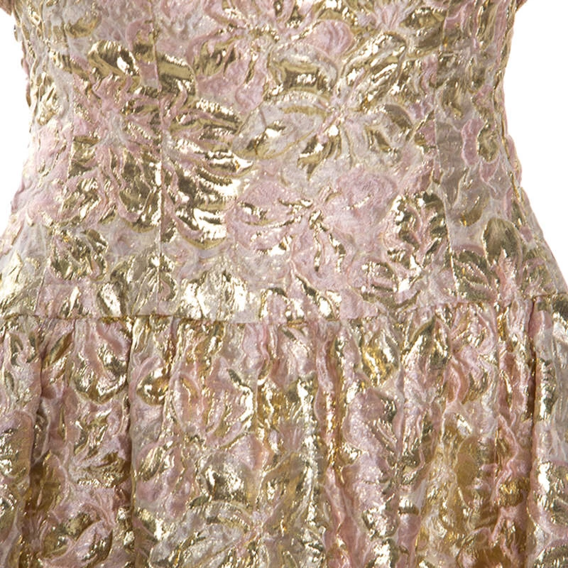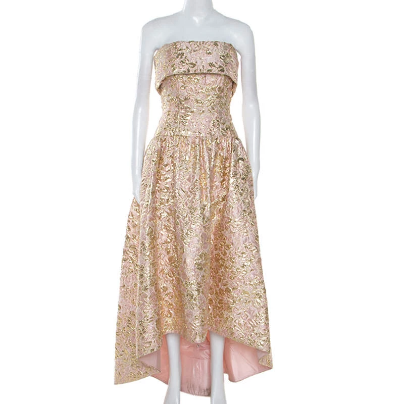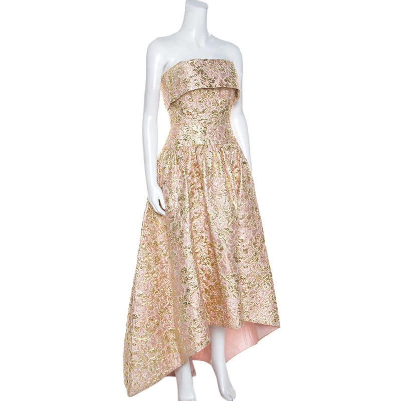 Make a unique style statement wearing this ravishing dress from the house of Oscar de la Renta. Wear this gold and pink number with your favourite accessories for a glamorous yet edgy look. Ladylike and dressy, this dress is crafted from a blend of quality fabrics and exudes a brocade finish. Having a strapless silhouette with a fitted bodice and flared skirt, the outfit has an asymmetric hemline and is secured by zip fastenings at the rear. This gorgeous creation is a treasure in any woman’s collection.
