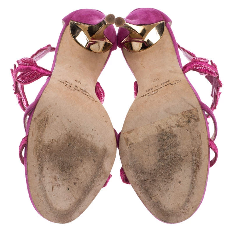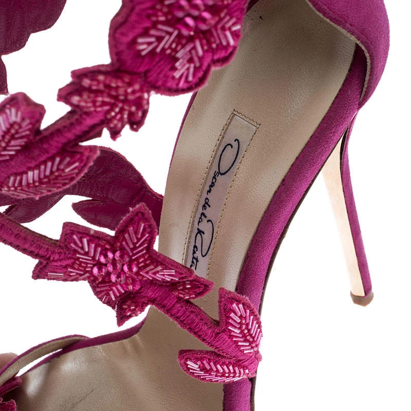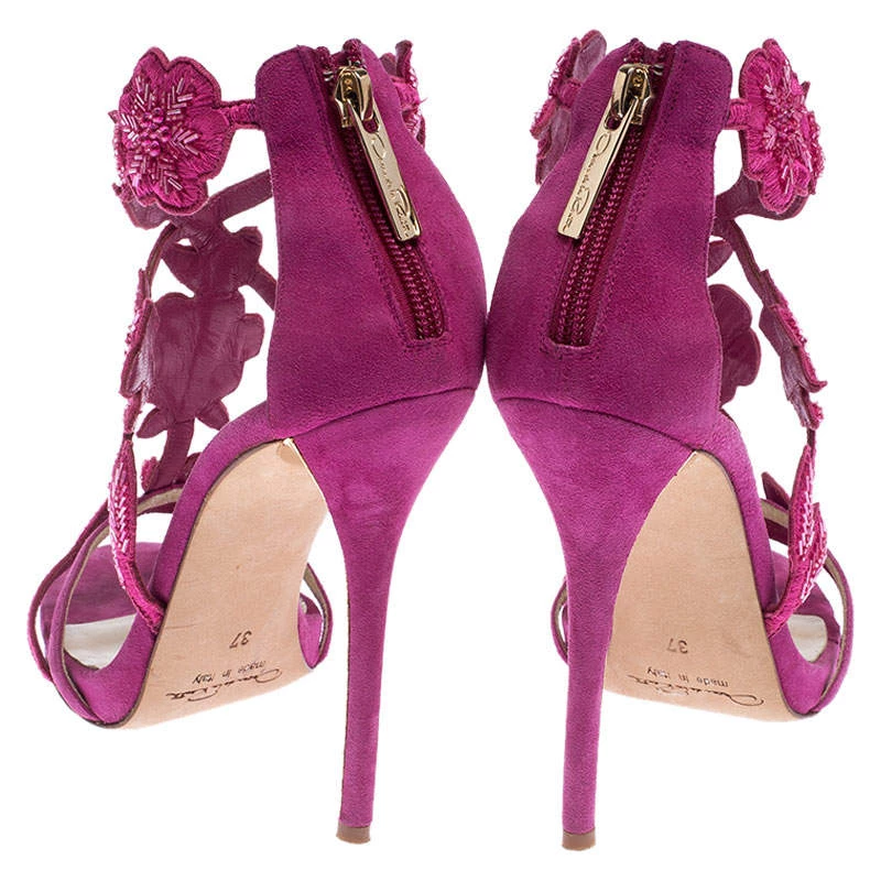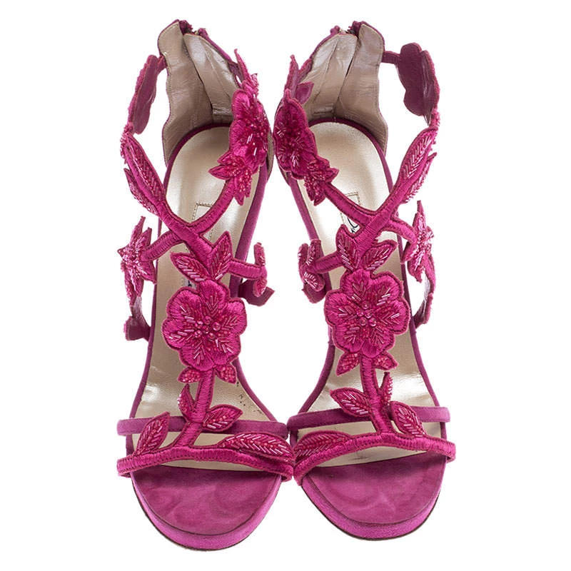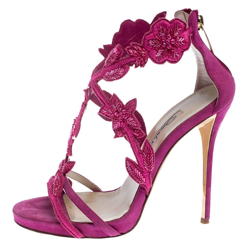 Oscar de la Renta brings forth a classic pair of sandals that exudes a look of sophisticated grace when paired with any ensemble. These suede sandals are crafted into a chic T-strap silhouette that makes them perfect accessories for any occasion. They feature a feminine pink hue and floral embellishments on the vamps. Complete with high heels, this Tatum pair is a must have.